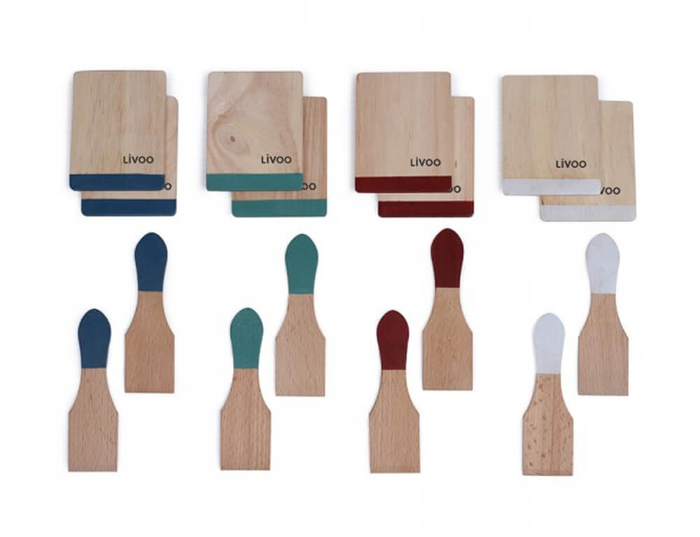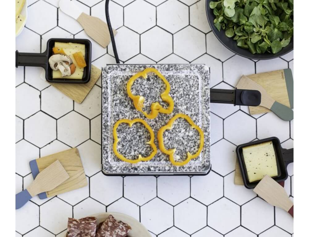 - Αυθεντικό σετ καουτσούκ με χρωματιστές πινελιές, αποτελούμενο από 8 σπάτουλες για το σερβίρισμα της ρακλέτας και 8 σανίδες για την τοποθέτηση του καυτού caquelon