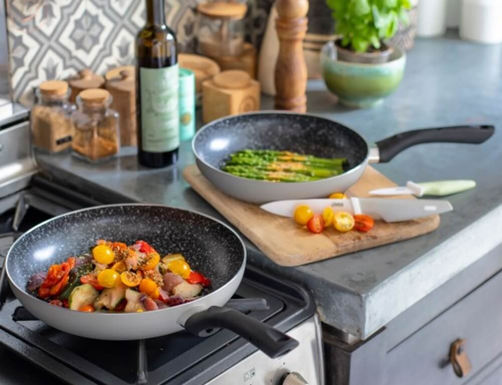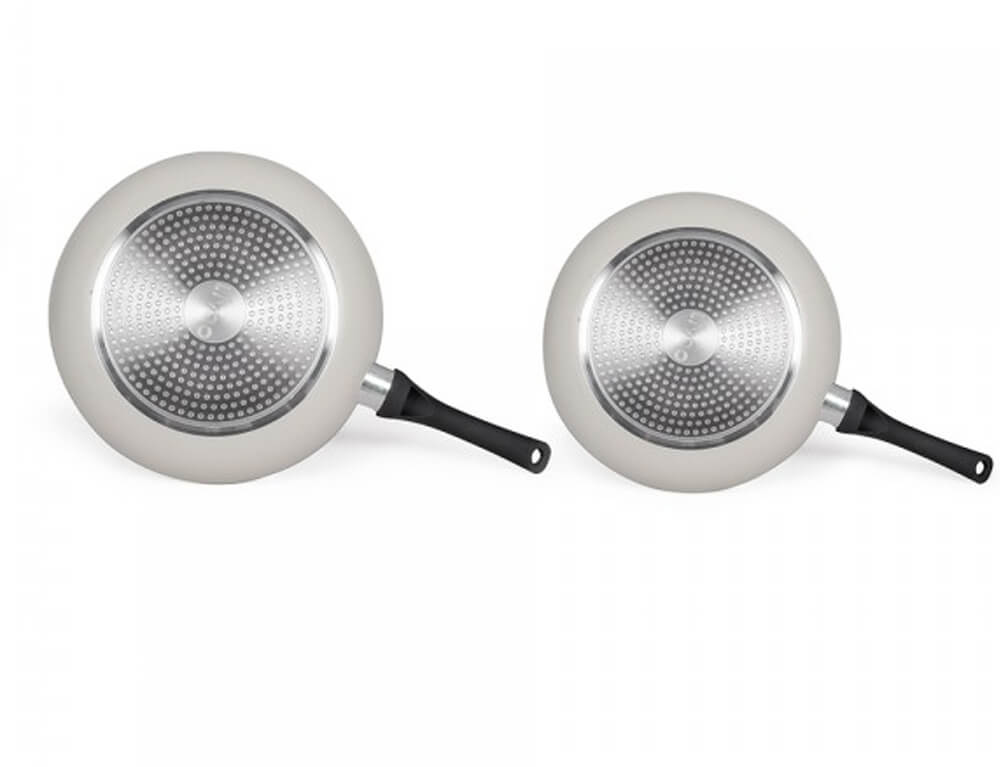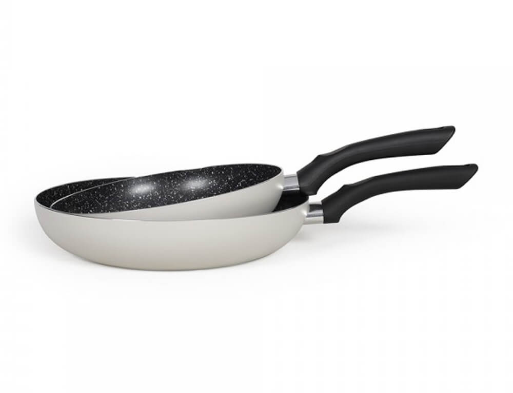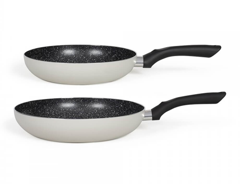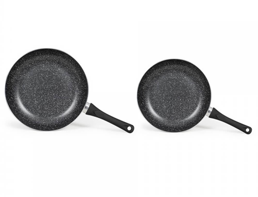 Σετ 2 τηγάνια αλουμινίου της Livoo με αντικολλητική επίστρωση πέτρας. Τα 2 τηγάνια είναι κατάλληλα για όλες τις εστίες.