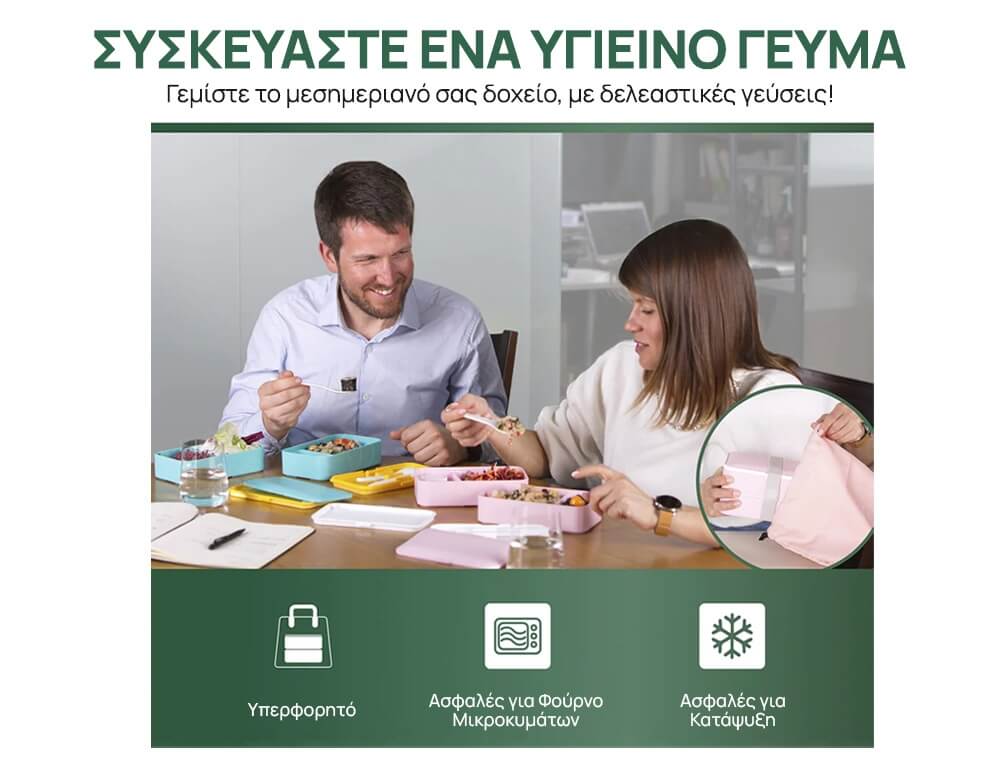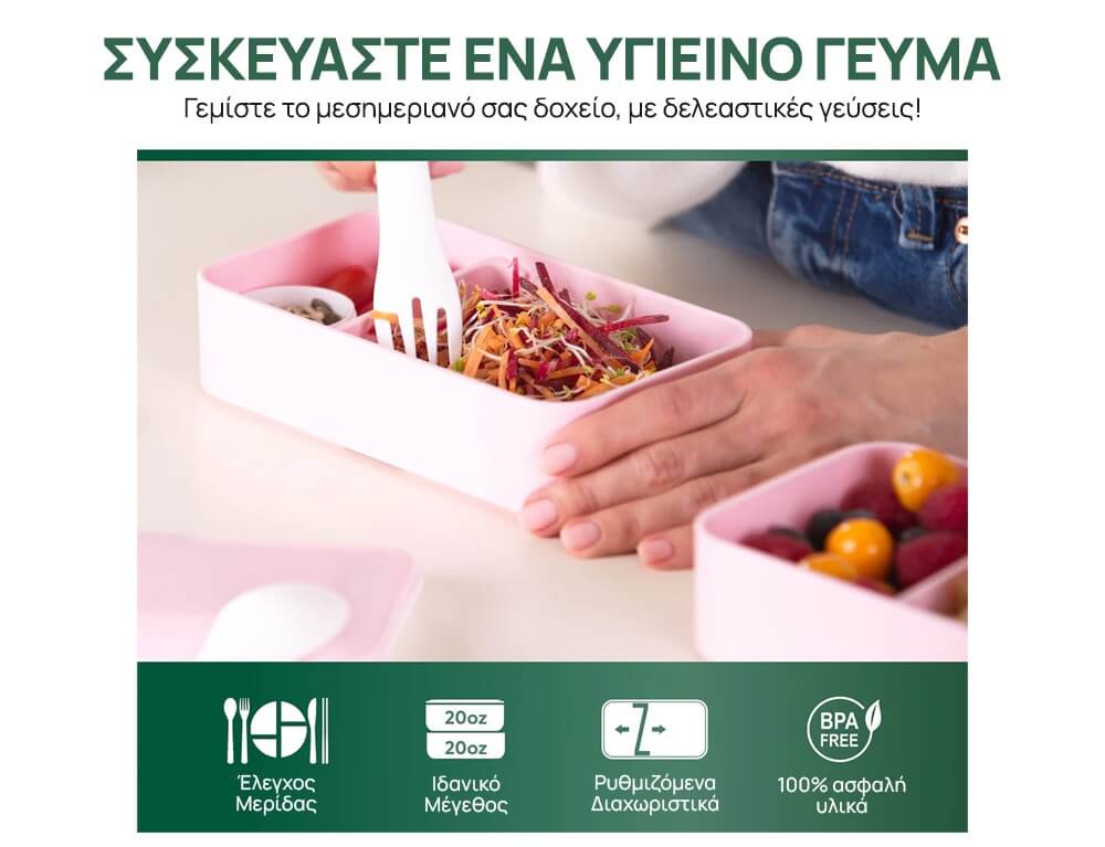 Χρησιμοποιήστε τα διπλά κουτιά bento με ρυθμιζόμενα διαχωριστικά για την προετοιμασία των φαγητών. Κάντε μια στρώση αλμυρή ή χρησιμοποιήστε την ως δοχείο σαλάτας/σάντουιτς και κάντε τη δεύτερη στρώση γλυκιά με φρούτα ή επιδόρπιο για μεσημεριανό γεύμα.