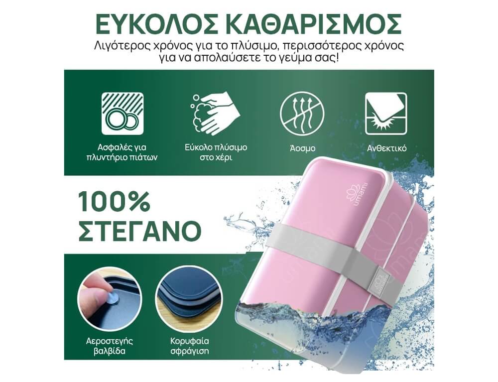 Είναι πραγματικά 100% στεγανό: ανάποδα, ή να ταρακουνιέται, η τσιμούχα σιλικόνης και ο ιμάντας εξασφαλίζουν ότι δεν θα χυθεί ποτέ τροφή ή υγρό από κανένα από τα στρώματα του κουτιού τύπου bento για ενήλικα.