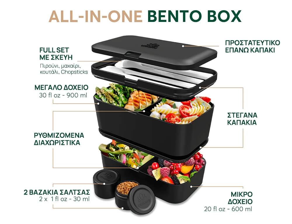 Περιλαμβάνει 4 σκεύη, 2 βάζα σάλτσας και 2 κινητά διαχωριστικά για απόλυτη ευκολία. Ό,τι χρειάζεστε σε ένα lunch box bento για ενήλικες.