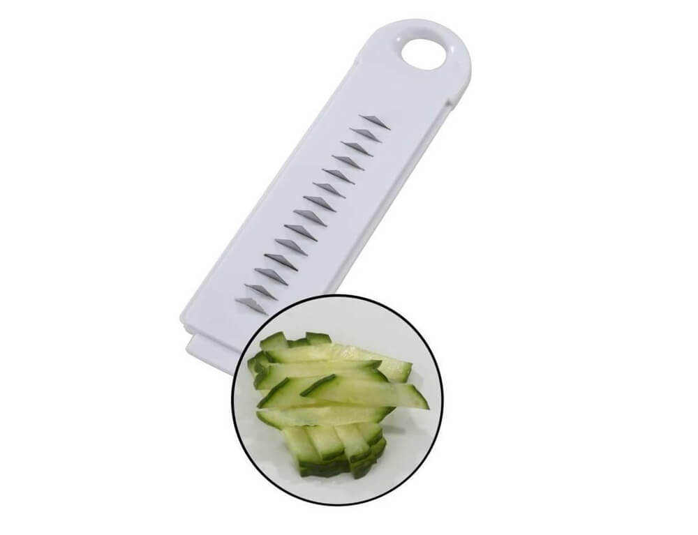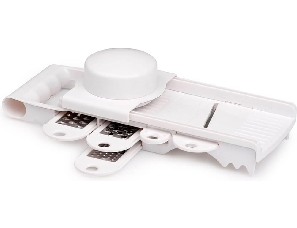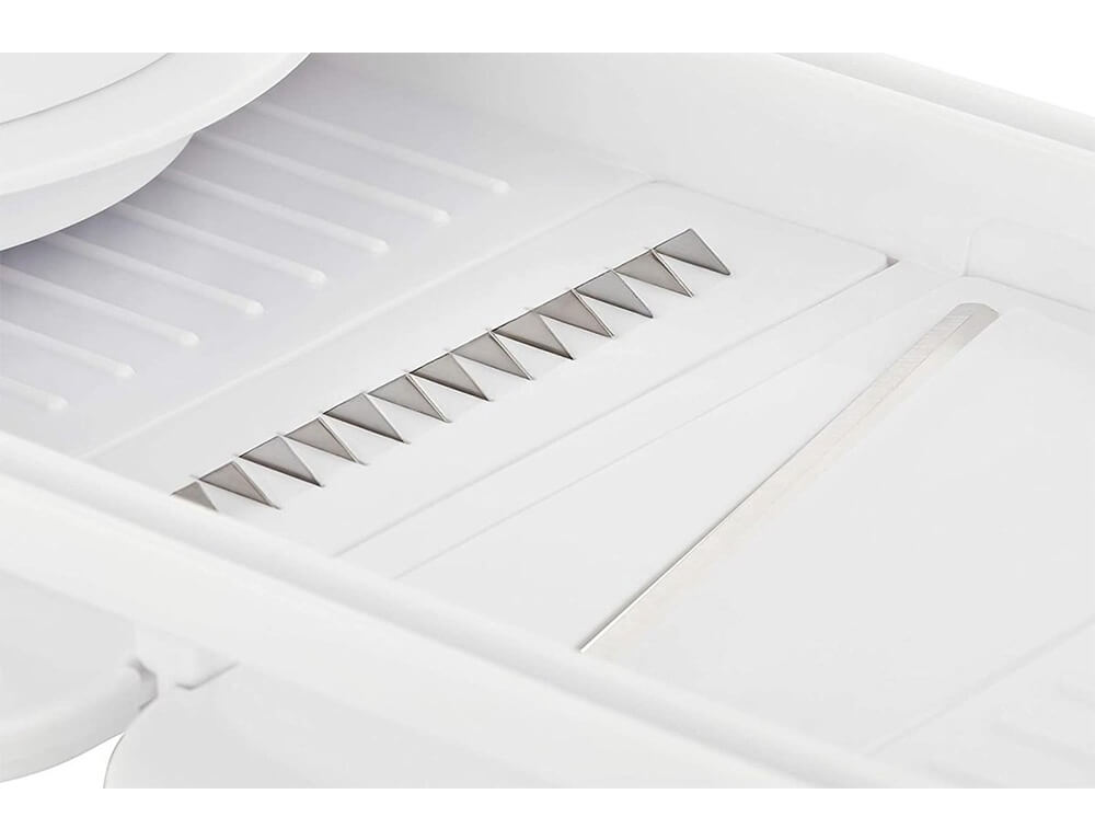 Είναι κατασκευασμένο από πλαστικό και οι λεπίδες από ανοξείδωτο ατσάλι και είναι εξαιρετικά αιχμηρές. Στον τρίφτη λαχανικών είναι ενσωματωμένος προστατευτικός δακτύλων. Επομένως, το φαγητό μπορεί να χρησιμοποιηθεί μέχρι το τελευταίο κομμάτι χωρίς να τραυματιστούν τα δάχτυλά σας.