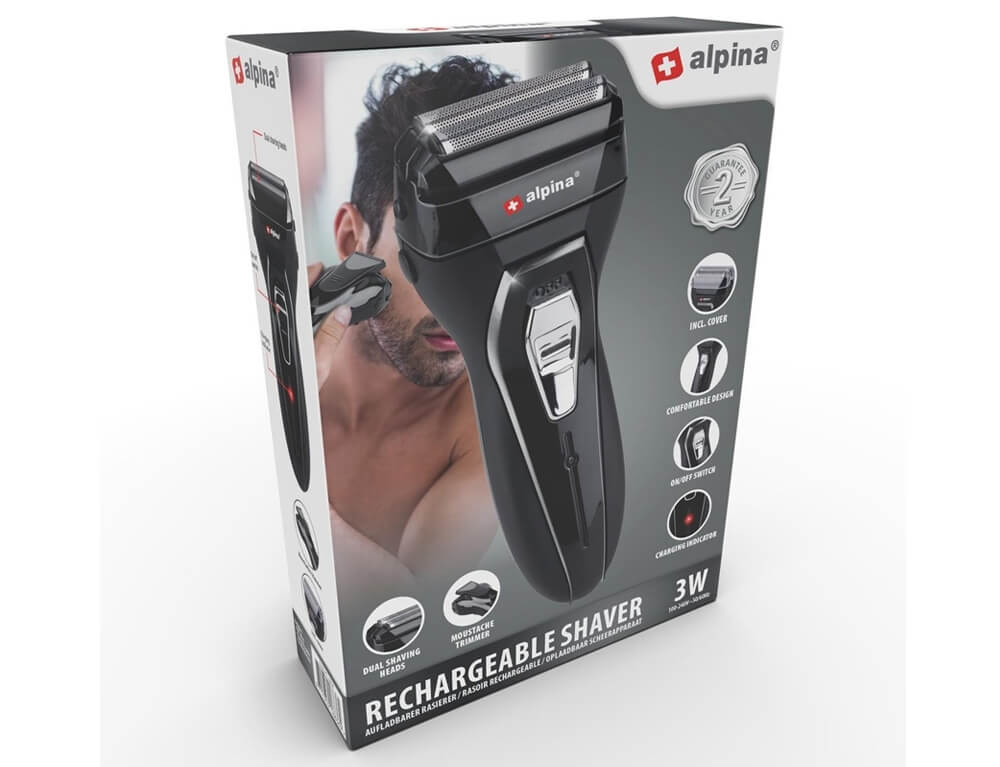 Γρήγορο, ομαλό και αξιόπιστο. Αυτό είναι το μόνο που θέλεις από μια ξυριστική μηχανή. Αυτή η ανδρική ξυριστική μηχανή της Alpina σας προσφέρει όλα όσα χρειάζεστε. Σύντομα θα εμφανιστείτε ωραία και καθαρά ξυρισμένη. Η συσκευή εφαρμόζει άνετα στο χέρι λόγω του απλοποιημένου σχήματός της. Τα διπλά φύλλα ξυρίσματος ακολουθούν αβίαστα το περίγραμμα του προσώπου σας. Με το εύχρηστο αναδυόμενο τρίμερ μπορείτε να κόψετε τακτοποιημένα τις πλάτες, τα γένια και/ή το μουστάκι σας.
