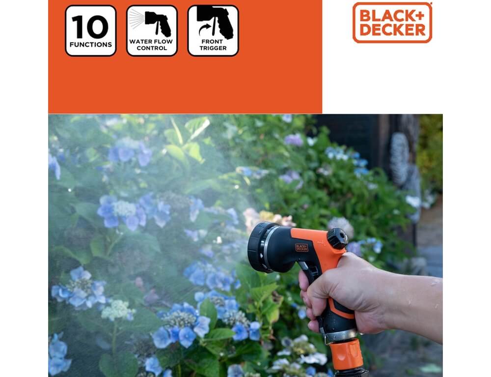 Το πιστόλι νερού Black+Decker με 10 ρυθμίσεις συνιστάται ιδιαίτερα για τους λάτρεις του κήπου. Αυτό το πιστόλι νερού προσφέρει 10 διαφορετικές ρυθμίσεις ψεκασμού, ώστε να μπορείτε εύκολα να κάνετε εναλλαγή μεταξύ του ποτίσματος ευαίσθητων λουλουδιών με λεπτή ομίχλη και του καθαρισμού επίμονων ρύπων με έναν ισχυρό πίδακα από το πιστόλι νερού.
