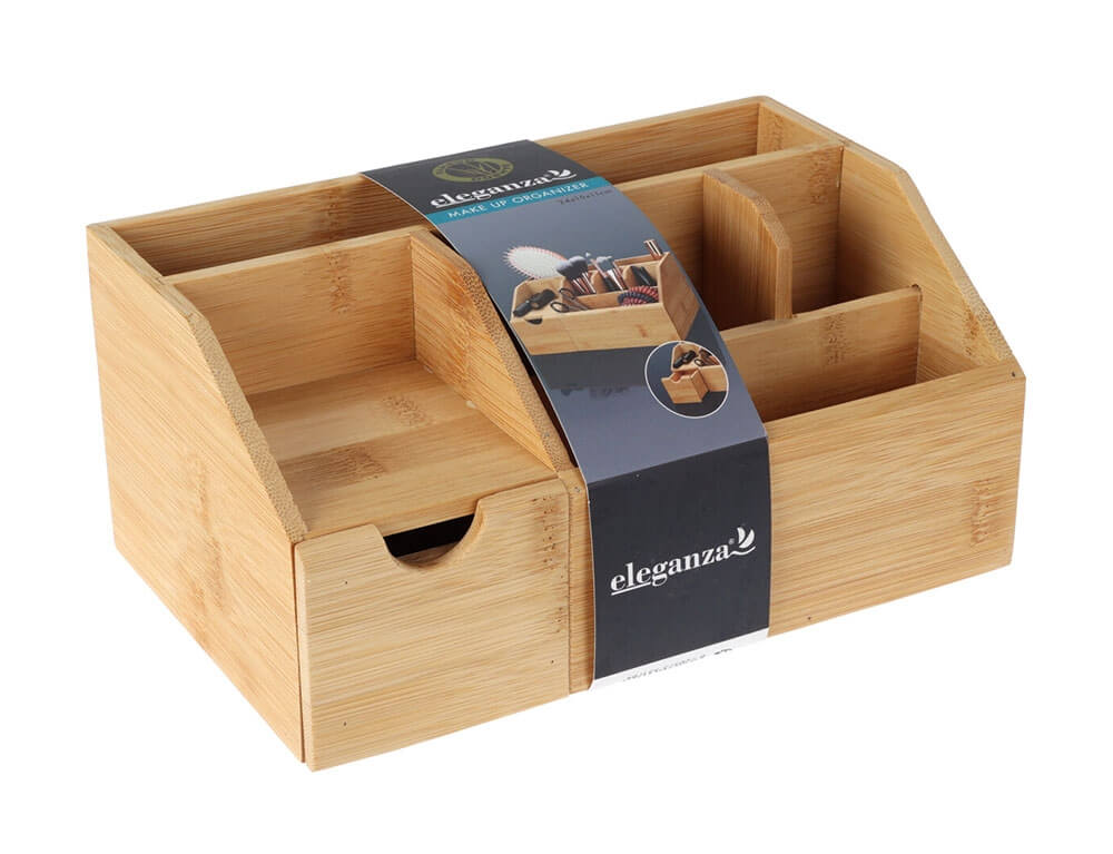 Οργανώστε το χώρο σας με το κουτί οργάνωσης από την Eleganza. Είναι κατασκευασμένο από ξύλο μπαμπού, ένα ανθεκτικό υλικό και ταιριάζει σε κάθε είδος διακόσμησης. Αποτελείται από 6 θέσεις διαφορετικών μεγεθών και 1 συρτάρι για να οργανώσετε τα καλλυντικά, πινέλα ή τα αξεσουάρ περιποίησης που χρησιμοποιείτε πιο συχνά.