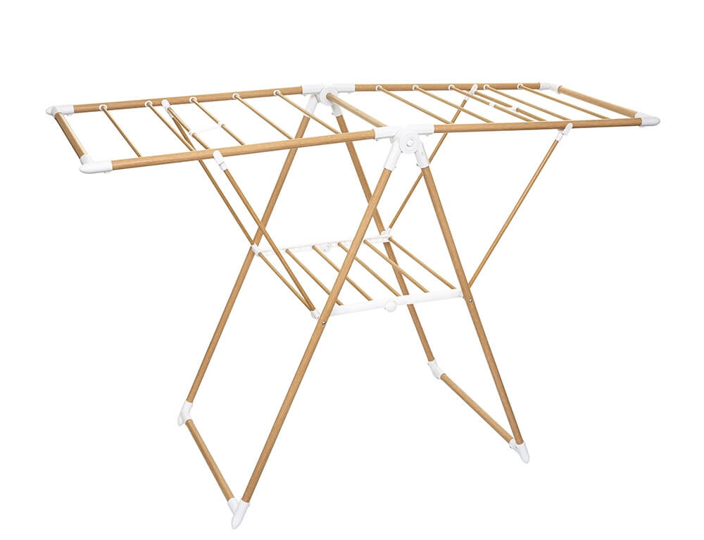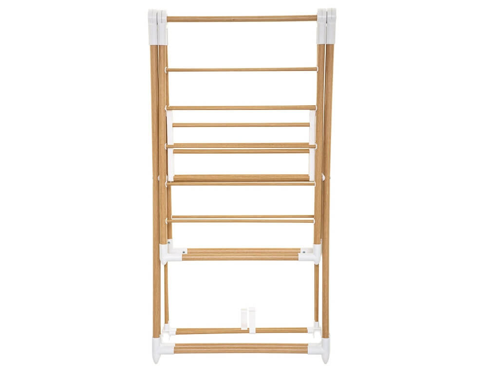 Πτυσσόμενη απλώστρα δαπέδου από την εταιρεία 5five. Με συνολικό μήκος απλώματος 20 μέτρα, χωράει τα ρούχα, τις πετσέτες ή τα σεντόνια σας. Είναι κατασκευασμένη από ανθεκτικό μεταλλικό υλικό σε καφέ χρώμα με εφέ ξύλου και διπλώνει ώστε να αποθηκεύεται εύκολα όταν δεν την χρησιμοποιείτε για εξοικονόμηση χώρου.