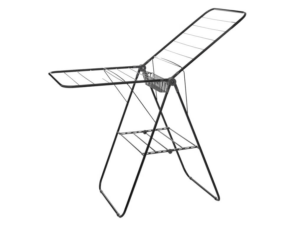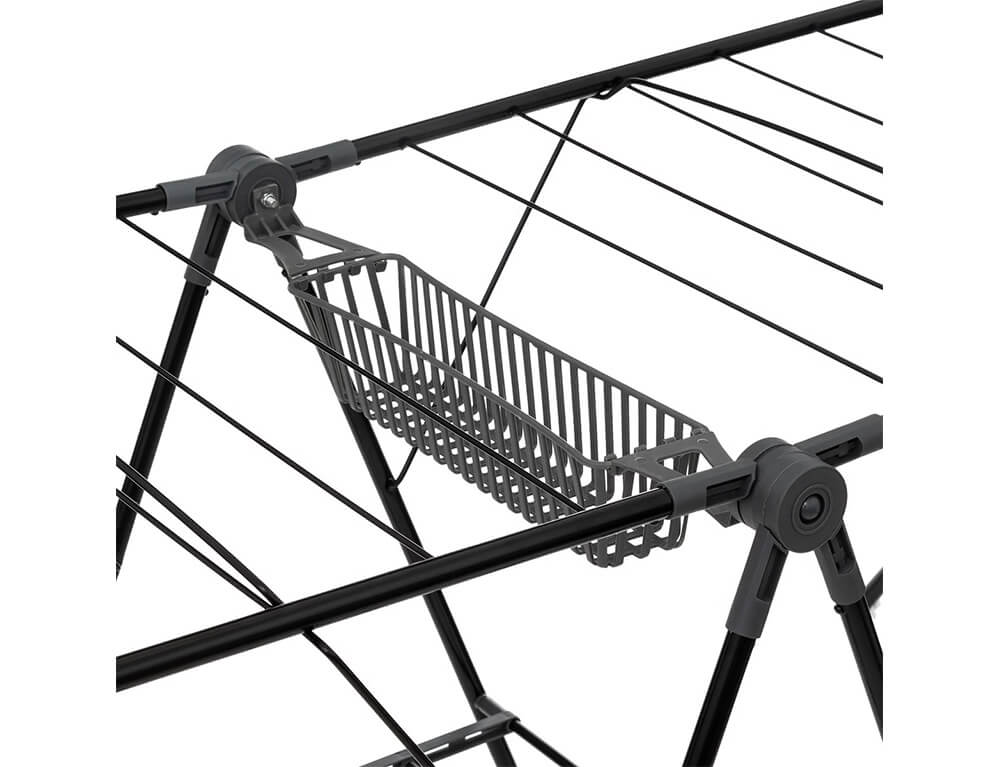 Πτυσσόμενη απλώστρα δαπέδου από την εταιρεία 5five. Με συνολικό μήκος απλώματος 13 μέτρα, χωράει τα ρούχα, τις πετσέτες ή τα σεντόνια σας. Είναι κατασκευασμένη από ανθεκτικό μεταλλικό υλικό σε μαύρο χρώμα και διπλώνει ώστε να αποθηκεύεται εύκολα όταν δεν την χρησιμοποιείτε για εξοικονόμηση χώρου. Περιλαμβάνει καλάθι για τα τσιμπιδάκια.