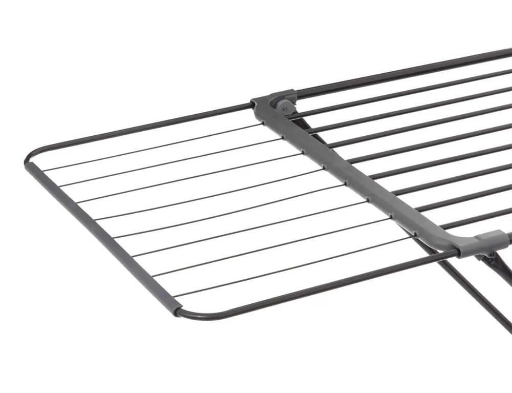 Πτυσσόμενη απλώστρα δαπέδου από την εταιρεία 5five. Με συνολικό μήκος απλώματος 20 μέτρα, χωράει τα ρούχα, τις πετσέτες ή τα σεντόνια σας. Είναι κατασκευασμένη από ανθεκτικό μεταλλικό υλικό σε μαύρο χρώμα και διπλώνει ώστε να αποθηκεύεται εύκολα όταν δεν την χρησιμοποιείτε για εξοικονόμηση χώρου.
