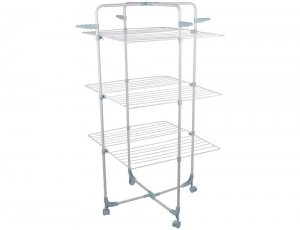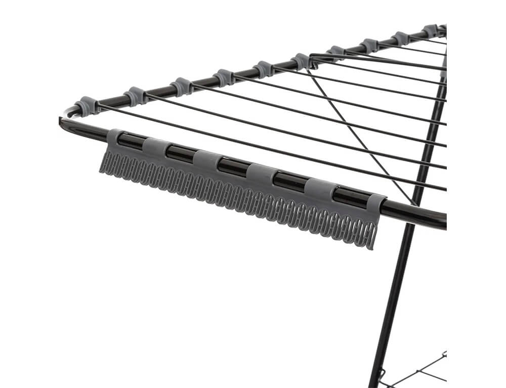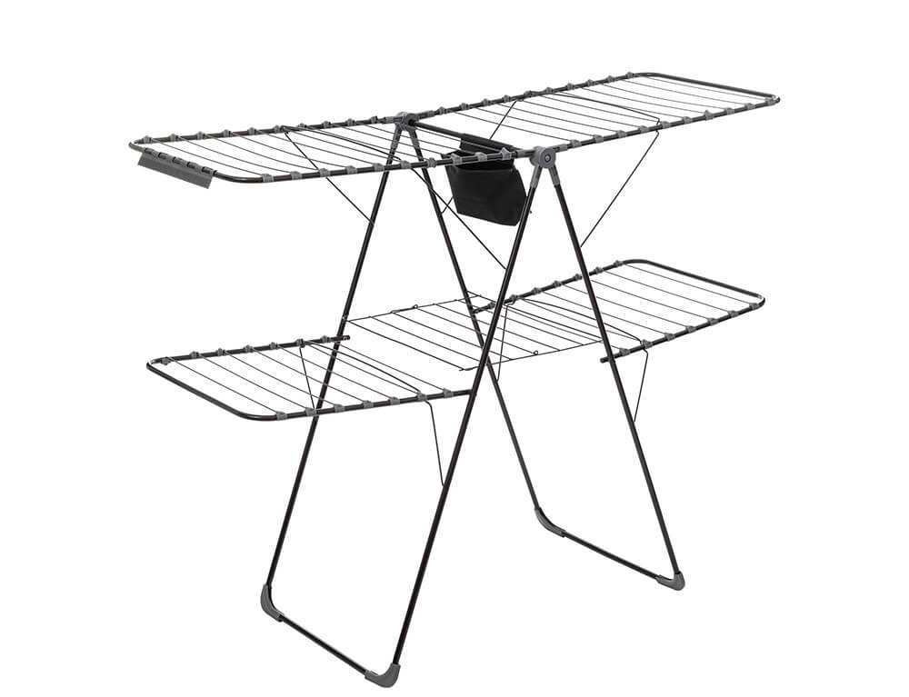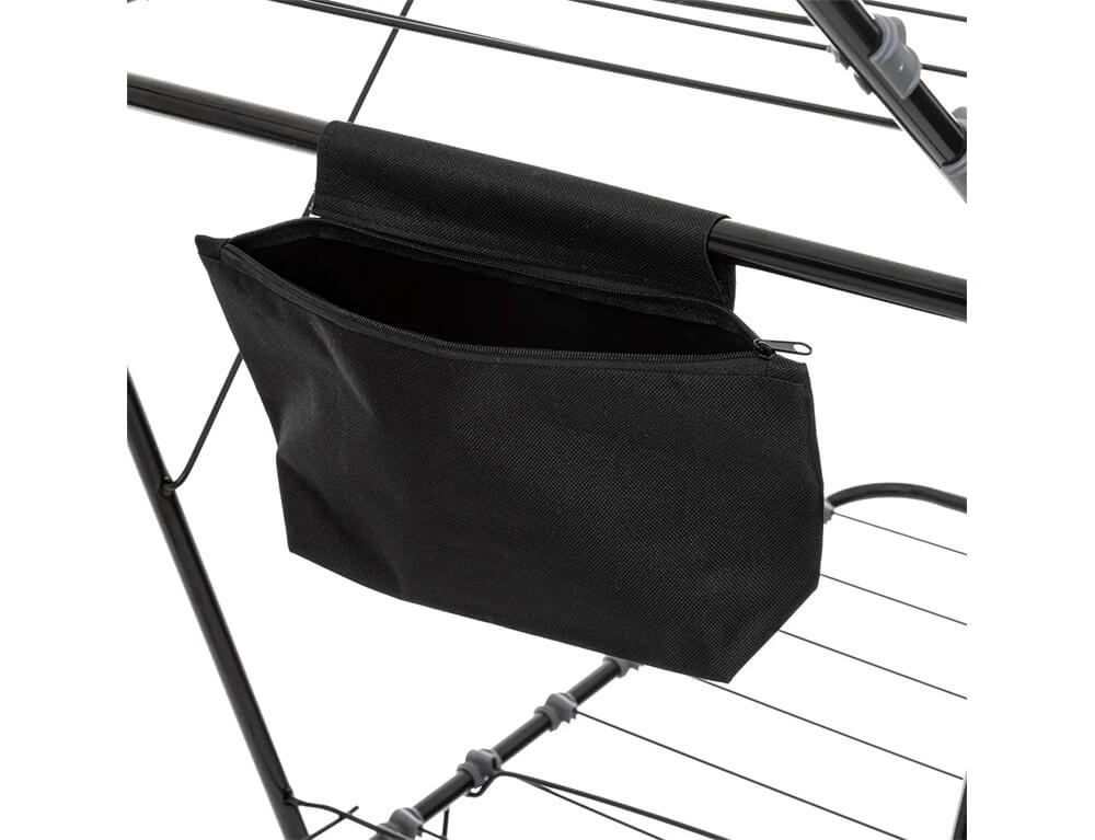 Πτυσσόμενη απλώστρα δαπέδου από την εταιρεία 5five. Με συνολικό μήκος απλώματος 31 μέτρα, χωράει τα ρούχα, τις πετσέτες ή τα σεντόνια σας. Είναι κατασκευασμένη από ανθεκτικό μεταλλικό υλικό σε μαύρο χρώμα και διπλώνει ώστε να αποθηκεύεται εύκολα όταν δεν την χρησιμοποιείτε για εξοικονόμηση χώρου. Περιλαμβάνει καλάθι για τα τσιμπιδάκια και διαθέτει 2 επίπεδα για κρέμασμα.
