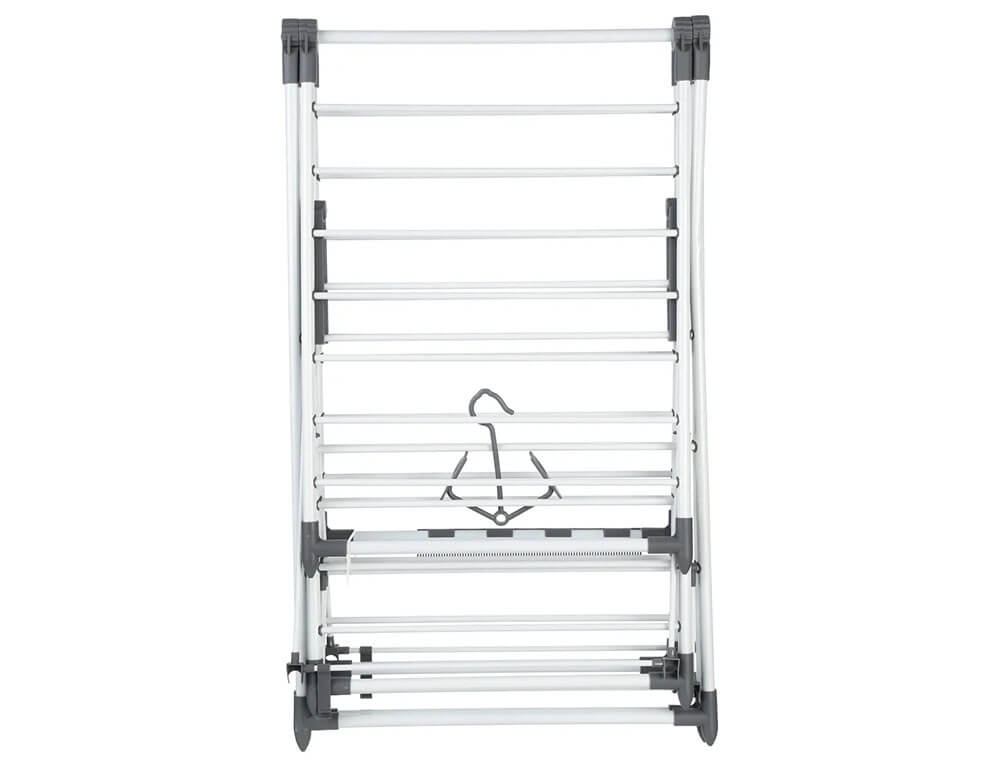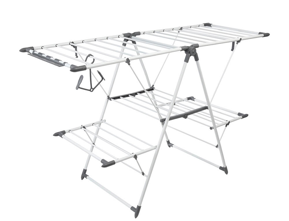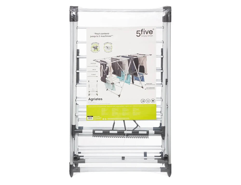 Πτυσσόμενη απλώστρα δαπέδου από την εταιρεία 5five. Με συνολικό μήκος απλώματος 24 μέτρα και 3 επίπεδα, χωράει τα ρούχα, τις πετσέτες ή τα σεντόνια σας. Είναι κατασκευασμένη από ανθεκτικό μεταλλικό υλικό σε γκρι χρώμα και διπλώνει ώστε να αποθηκεύεται εύκολα όταν δεν την χρησιμοποιείτε για εξοικονόμηση χώρου.