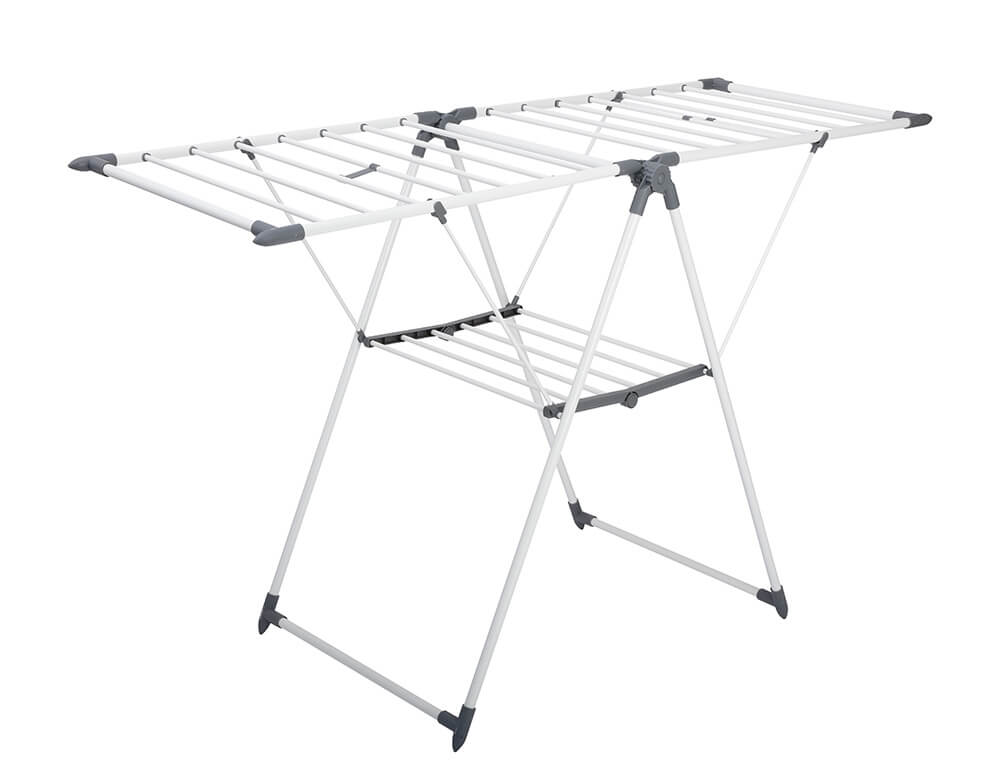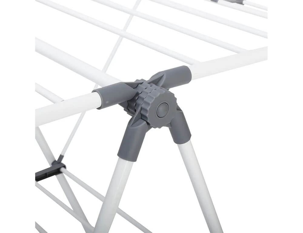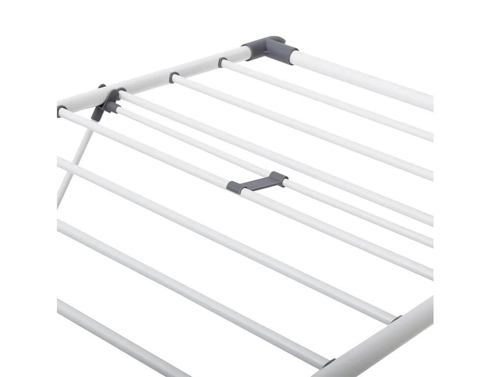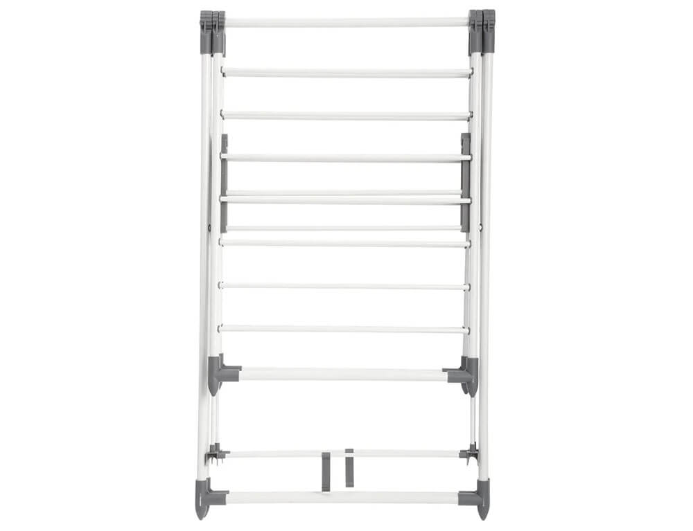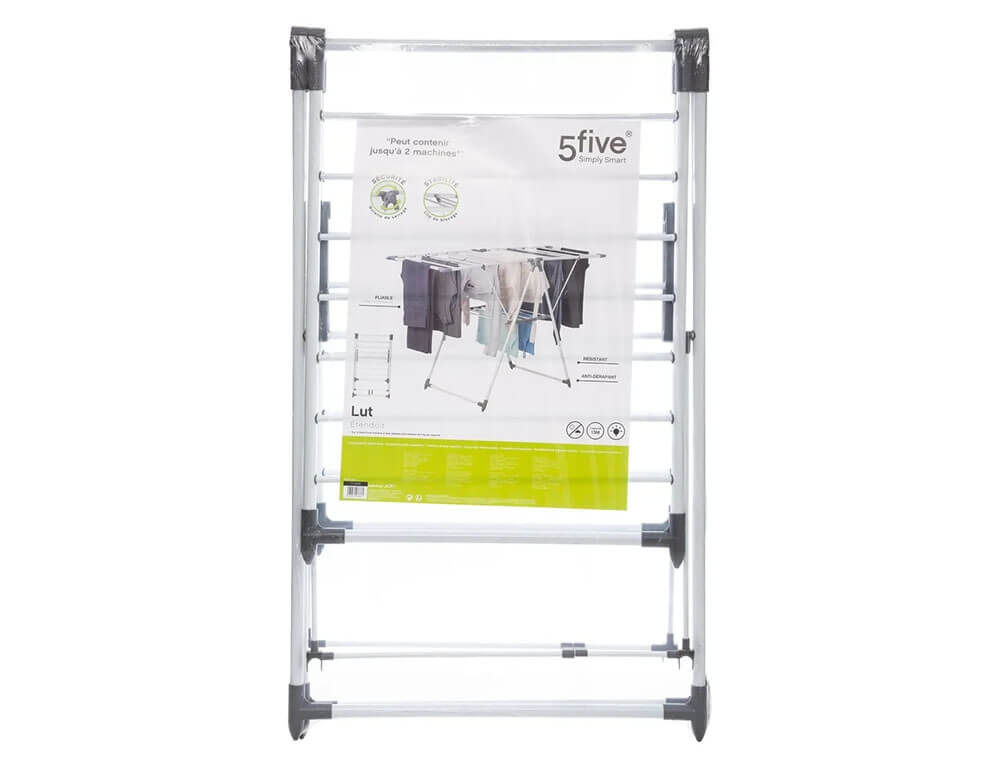 Πτυσσόμενη απλώστρα δαπέδου από την εταιρεία 5five. Με συνολικό μήκος απλώματος 15 μέτρα και 2 επίπεδα, χωράει τα ρούχα, τις πετσέτες ή τα σεντόνια σας. Είναι κατασκευασμένη από ανθεκτικό μεταλλικό υλικό σε λευκό χρώμα με γκρι λεπτομέρειες και διπλώνει ώστε να αποθηκεύεται εύκολα όταν δεν την χρησιμοποιείτε για εξοικονόμηση χώρου.