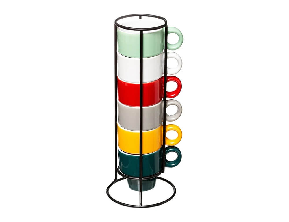 Με το σετ κούπες της Secret de Gourmet μπορείτε να απολαύσετε το αγαπημένο σας ρόφημα είτε είναι ζεστό είτε κρύο. Είναι κατασκευασμένες από κεραμικό υλικό και έχουν γυαλιστερό φινίρισμα και τα χρώματα τους δίνουν μια ευχάριστη αίσθηση στο τραπέζι σας. Διαθέτουν λαβή άνετη για πιο εύκολη χρήση. Το σετ διαθέτει μεταλλική βάση και οι κούπες στοιβάζονται η μία μέσα στην άλλη, ώστε να είναι η κουζίνα σας πιο οργανωμένη, ενώ πιάνει και λιγότερο χώρο.