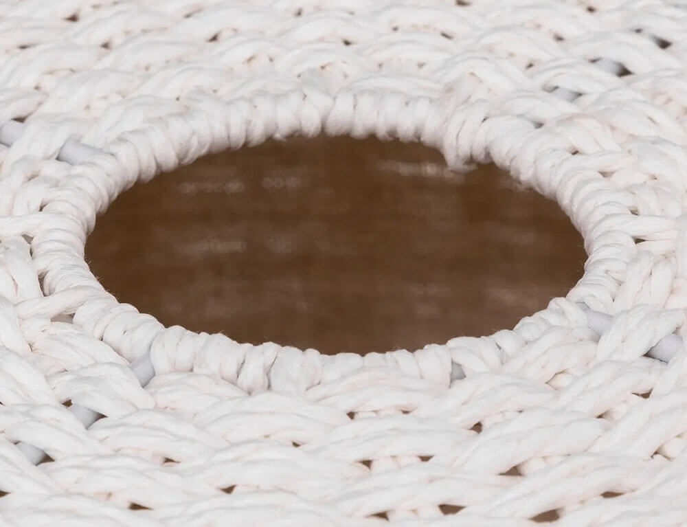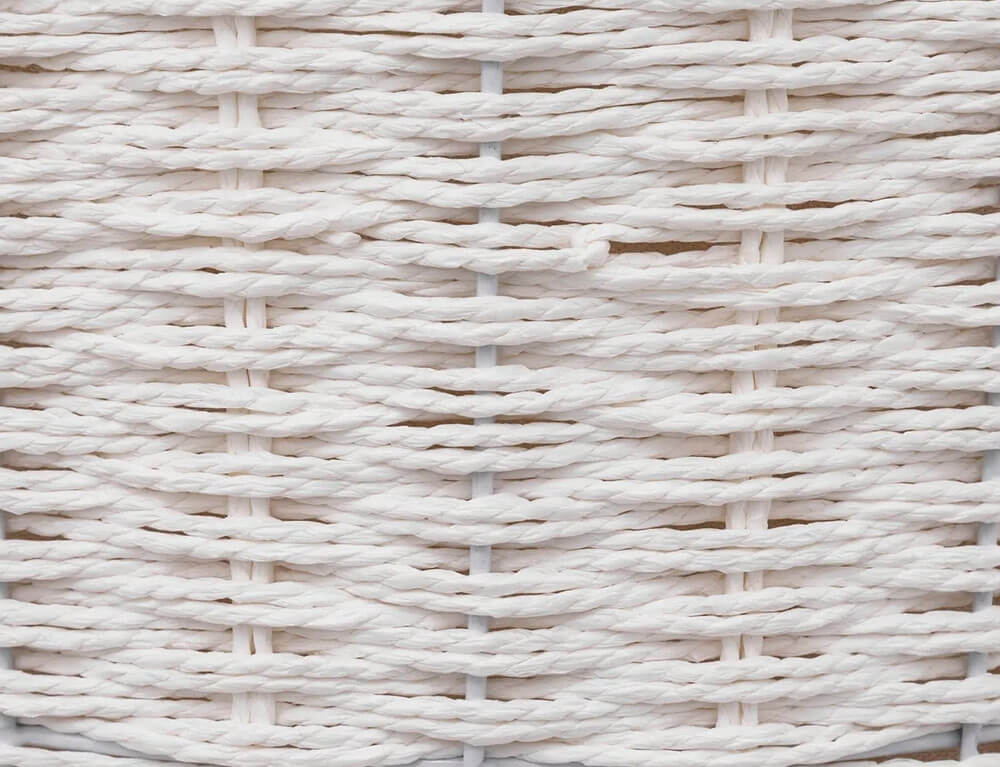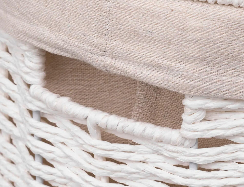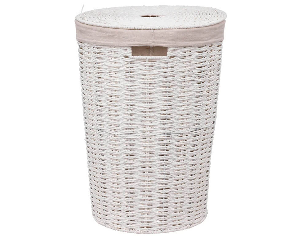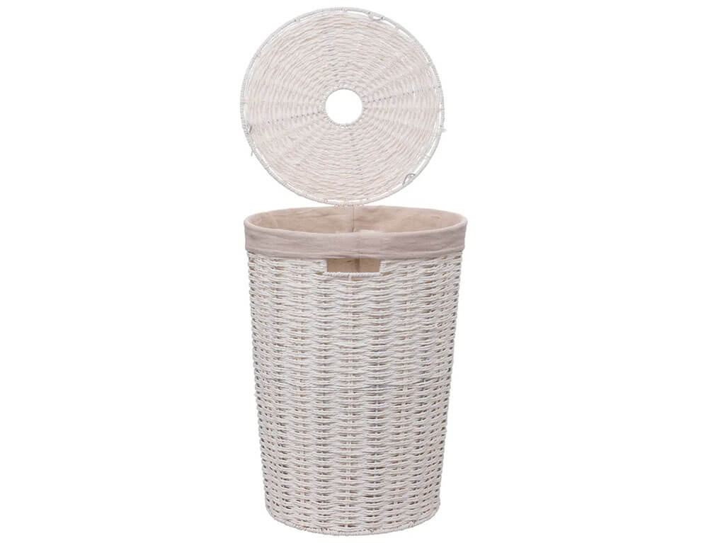Καλάθι απλύτων με καπάκι κατασκευασμένο από ψάθα σε λευκή απόχρωση. Το καλάθι ρούχων είναι απόλυτα κατάλληλο για μικρούς χώρους και κρατά τα βρώμικα ρούχα σας κρυμμένα. Το ανθεκτικό υλικό και η πολυτελής εμφάνιση αυτού του καλαθιού για άπλυτα ρούχα δίνουν στο μπάνιο σας μια εντελώς νέα εμφάνιση. Εσωτερικά διαθέτει υφασμάτινη θήκη για να μην φεύγουν τα ρούχα σας έξω από το καλάθι. Η θήκη αφαιρείται εύκολα και μπορεί να πλυθεί.