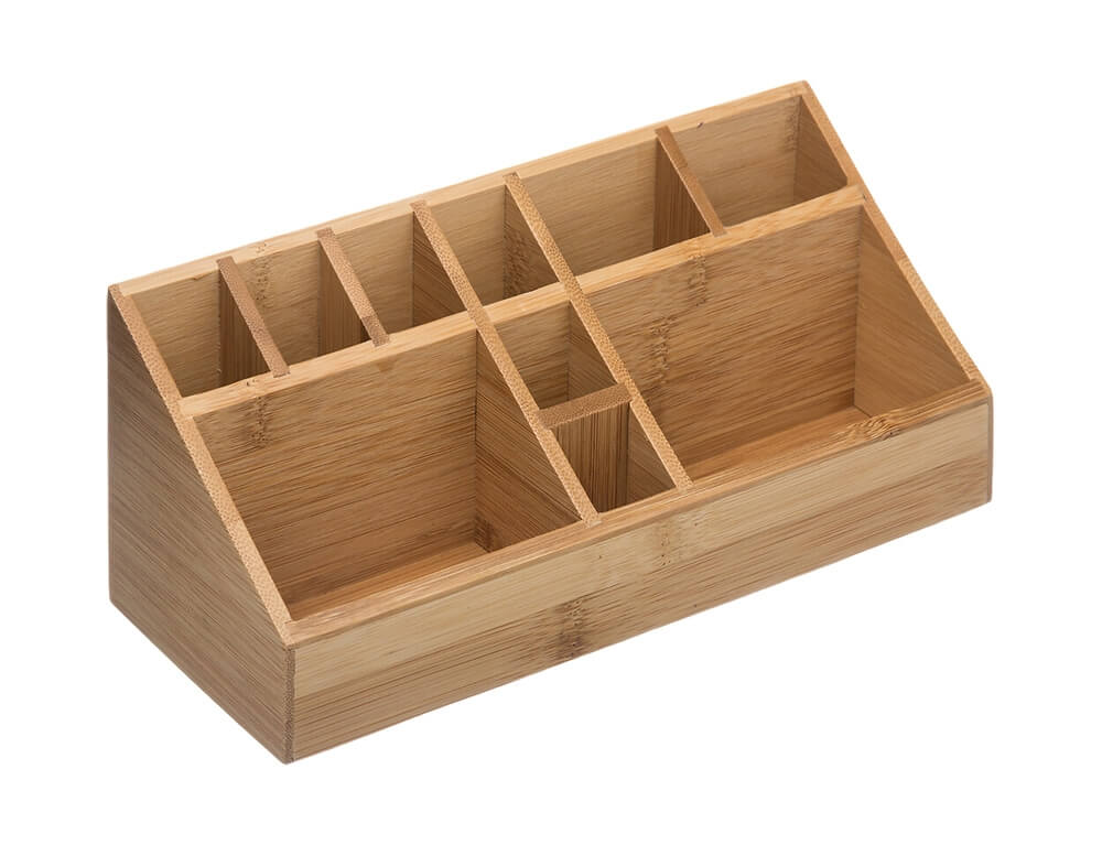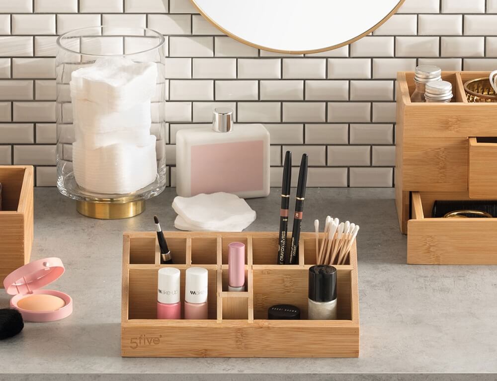 Οργανώστε το χώρο σας με το κουτί οργάνωσης από την 5five. Είναι κατασκευασμένο από ξύλο μπαμπού, ένα ανθεκτικό υλικό και ταιριάζει σε κάθε είδος διακόσμησης. Αποτελείται από 10 θέσεις διαφορετικών μεγεθών για να οργανώσετε τα καλλυντικά, πινέλα ή τα αξεσουάρ περιποίησης που χρησιμοποιείτε πιο συχνά.