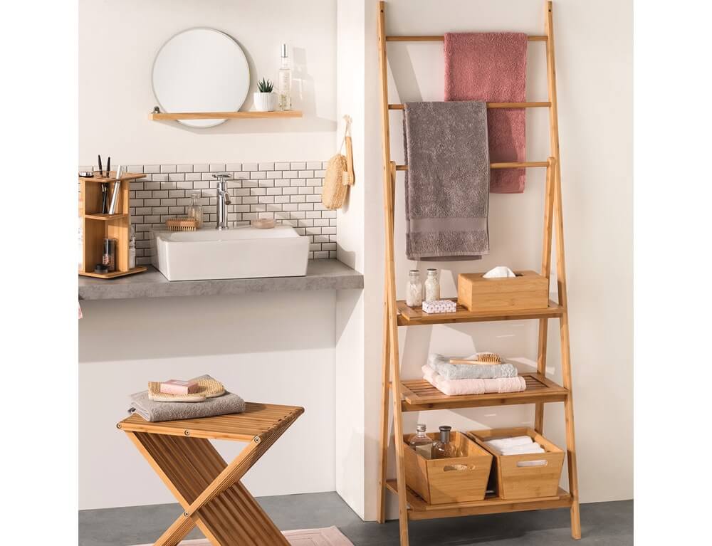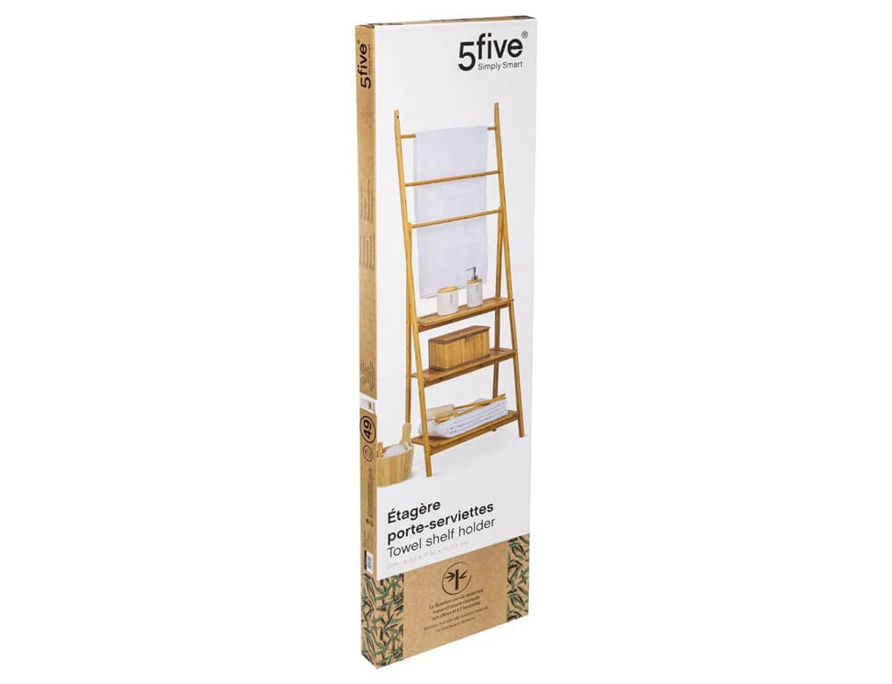 Αυτή η κρεμάστρα από μπαμπού από την 5five είναι μια τέλεια επιλογή για να κρεμάσετε τις πετσέτες και το μπουρνούζι σας για να στεγνώσουν διατηρώντας το εσωτερικό του μπάνιου σας κομψό. Διαθέτει επίσης και 3 ράφια για να τοποθετήσετε διάφορα είδη μπάνιου και διακοσμητικά. Είναι κατασκευασμένο από ξύλο μπαμπού, ένα υλικό φιλικό προς το περιβάλλον και ανθεκτικό στο χρόνο. Επίσης, είναι λιγότερο επιρρεπές σε φούσκωμα και μπορεί να καθαριστεί εύκολα.