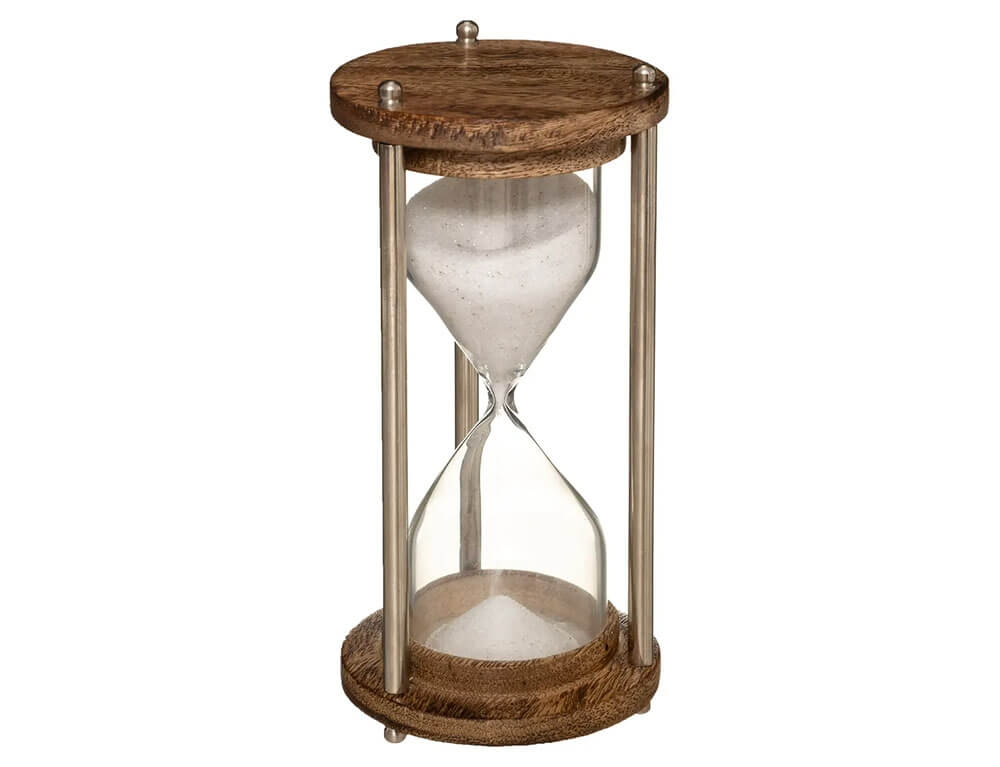 Διακοσμήστε το σαλόνι ή το γραφείο σας με την κλεψύδρα από την εταιρεία Atmosphera. Είναι κατασκευασμένη από γυαλί και εσωτερικά έχει άμμο σε λευκό χρώμα. Διαθέτει βάση από ξύλο μάνγκο και μεταλλικά στηρίγματα σε απόχρωση ξύλου. H κλεψύδρα έχει διάρκεια περίπου 5 λεπτά. Τοποθετήστε την στην τραπεζαρία ή στο τραπεζάκι του σαλονιού για να δώσετε μια μοναδική νότα στο χώρο σας.