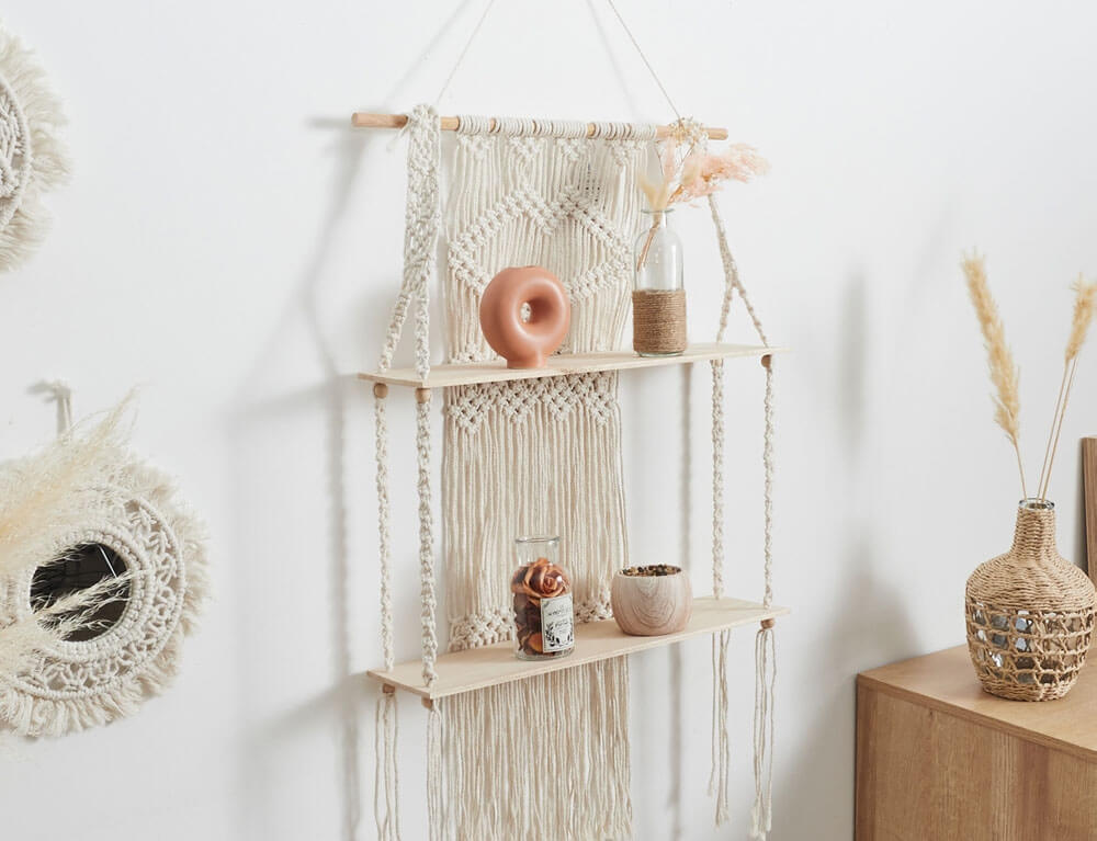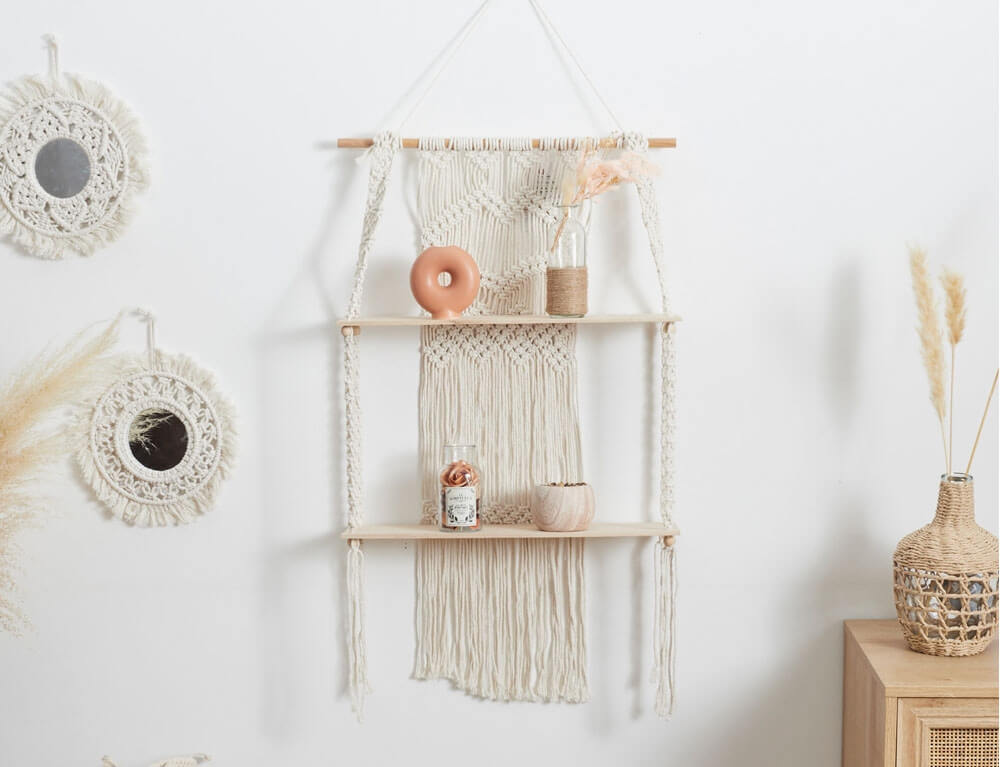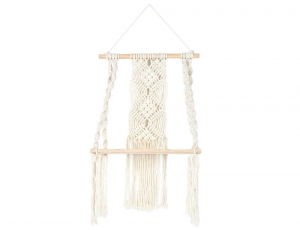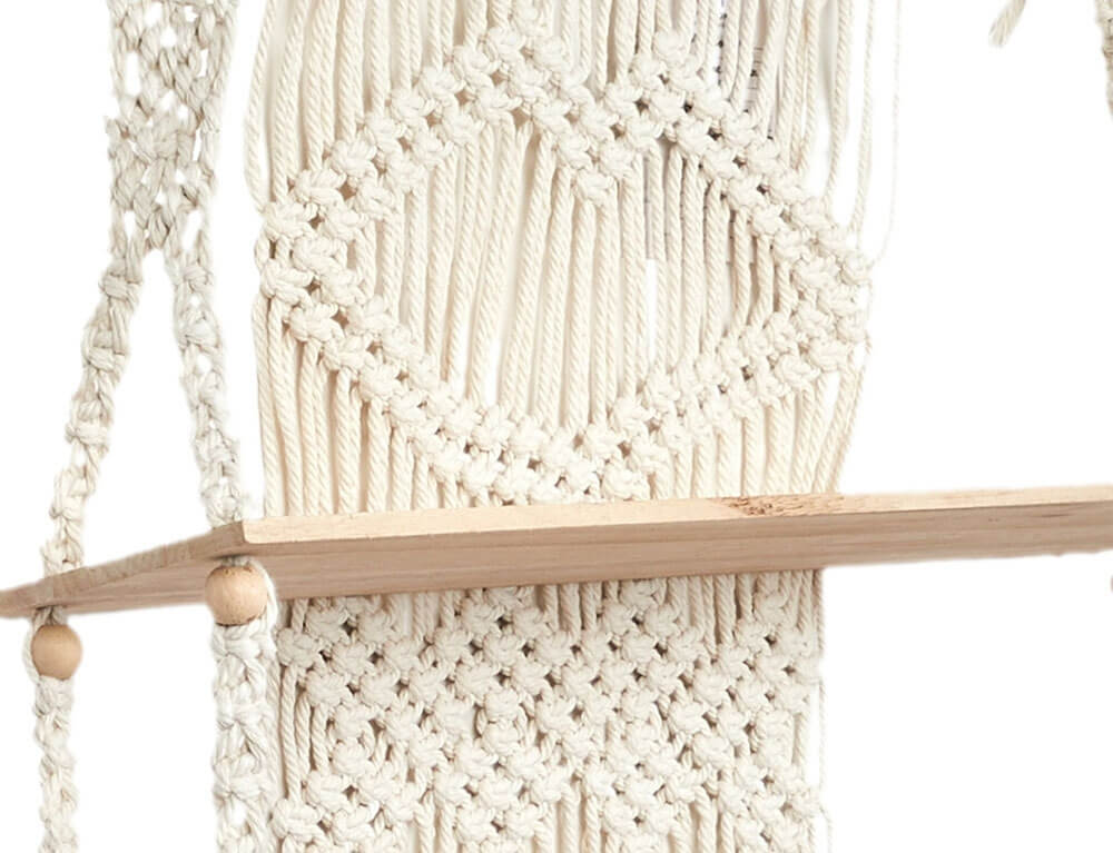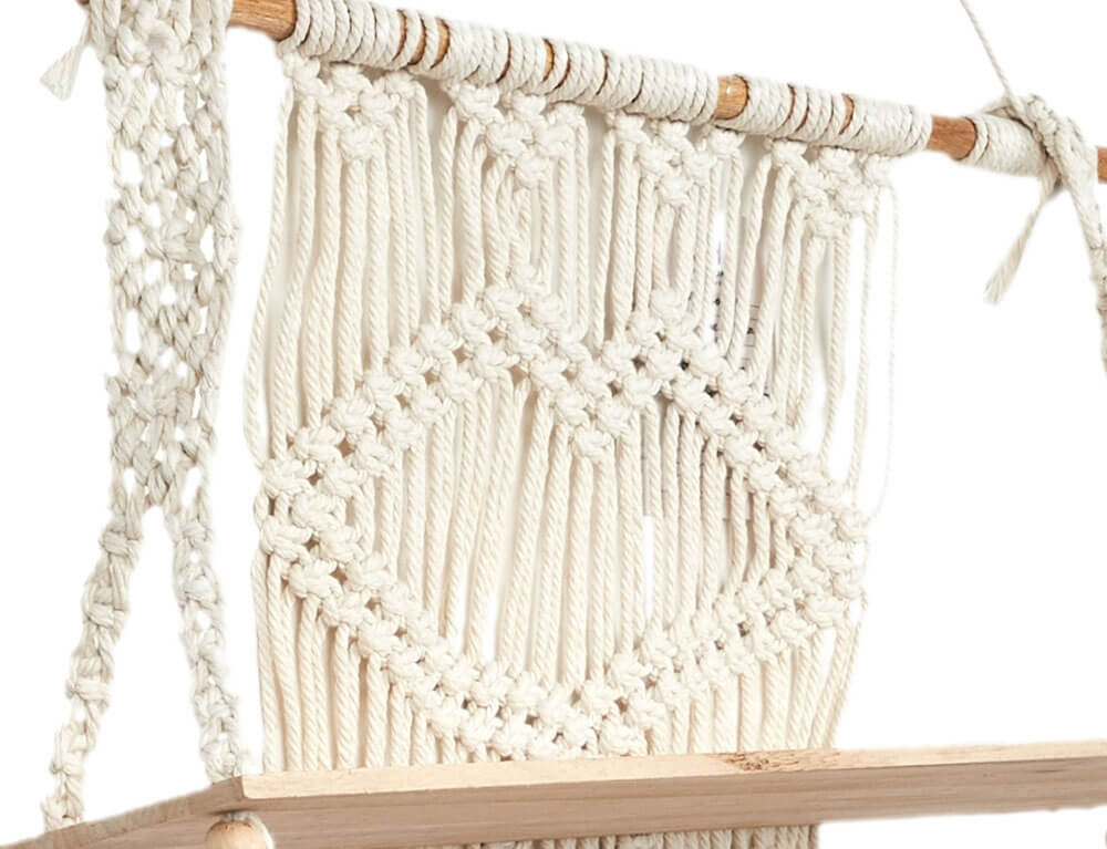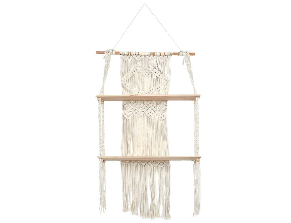Διακόσμησε και οργάνωσε το χώρο σου με τη ξύλινη ραφιέρα με εντυπωσιακό πλεκτό μακραμέ στην πλάτη σε boho ύφος και φυσική απόχρωση. Θα δώσει μια φυσική και χειροποίητη πινελιά στον χώρο σας, δημιουργώντας μια ζεστή και ατμοσφαιρική αίσθηση που θα εντυπωσιάσει τους επισκέπτες σας.