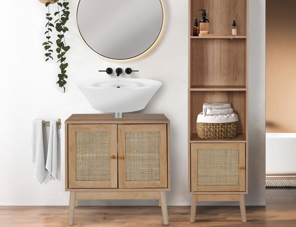 Τακτοποιήστε και οργανώστε το μπάνιο σας με το ντουλάπι μπάνιου από την Home Deco Factory. Αποτελείται από δύο πόρτες και ένα ράφι και προσφέρει άφθονο αποθηκευτικό χώρο για να διατηρείτε τα διάφορα καθημερινά σας απαραίτητα καλά οργανωμένα. Είναι κατασκευασμένο από MDF με σχέδιο πλέξης από φυσικό ρατάν στην πόρτα, το οποίο προσθέτει επιπλέον ομορφιά.