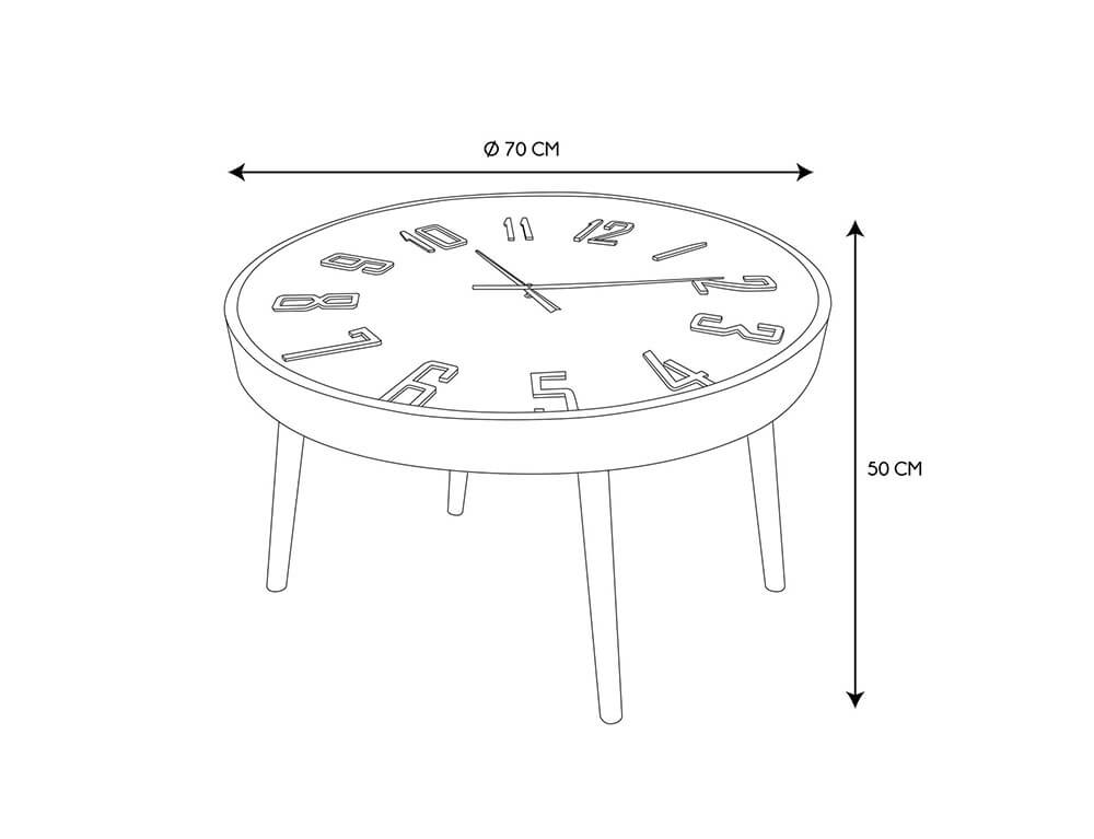Το βοηθητικό τραπεζάκι σαλονιού με ρολόι είναι ιδανικό για τοποθέτηση στο πλάι του καναπέ αλλά και σε διαφορετικά σημεία του σπιτιού προσφέροντας επιπλέον χώρο για την τοποθέτηση διακοσμητικών ή άλλων μικροαντικειμένων. Είναι στρογγυλό και κατασκευασμένο από MDF (ινοσανίδα), ένα παράγωγο ξύλου από κομμάτια, ίνες και υπολείμματα ξύλου. Διαθέτει 4 πόδια από ξύλο πεύκου, για περισσότερη σταθερότητα. Διαθέτει, επίσης, ρολόι, το οποίο λειτουργεί με μια μπαταρία AA 1.5 V (δεν περιλαμβάνεται).