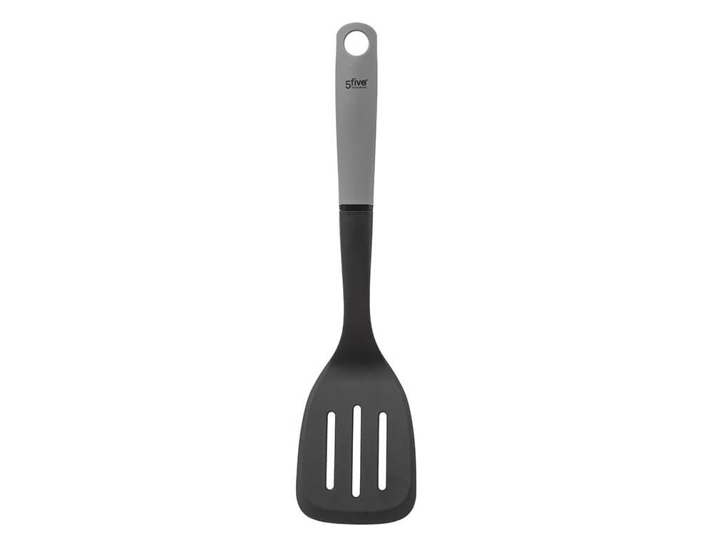 Με τη σπάτουλα μαγειρικής από τη 5five μπορείτε να αναμείξετε, γυρίσετε και να σερβίρετε τις δημιουργίες σας. Κατασκευασμένη από πλαστικό υψηλής ποιότητας, το οποίο είναι κατάλληλο για τρόφιμα, ενώ ταυτόχρονα την καθιστά ιδιαίτερα ανθεκτική στη θερμοκρασία έως και τους 200οC. Η πρακτική οπή στην άκρη της λαβής σας δίνει τη δυνατότητα να την κρεμάτε. Οι σχισμές στην επιφάνεια της σπάτουλας επιτρέπουν την στράγγιση του φαγητού από το νερό ή το λάδι μαγειρέματος.
