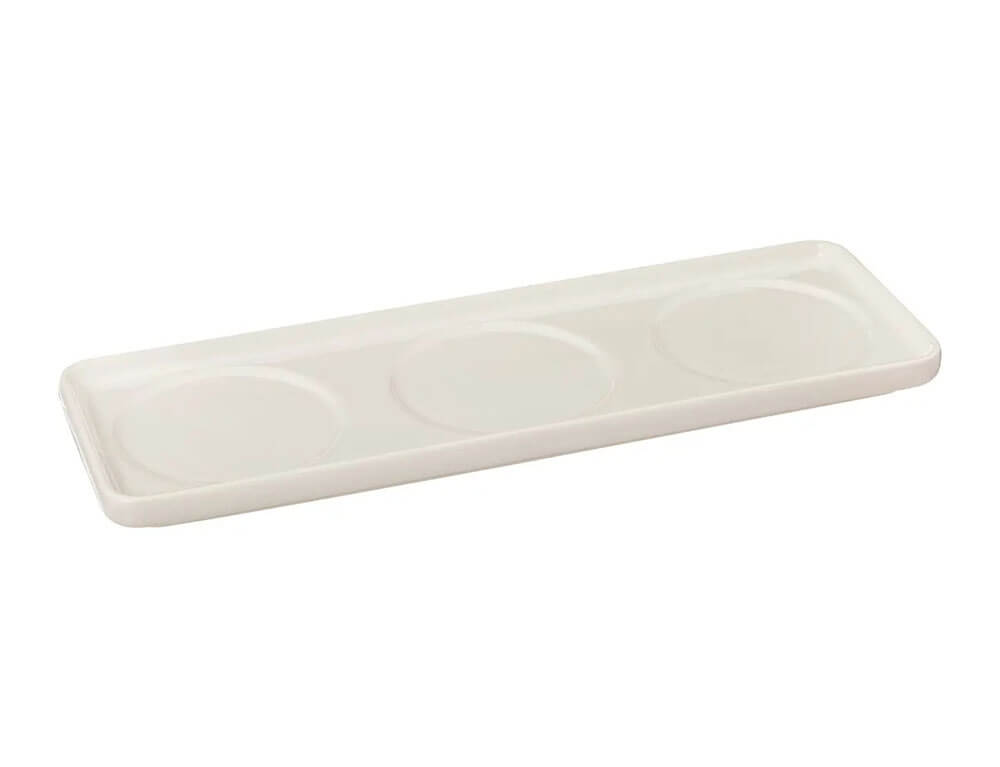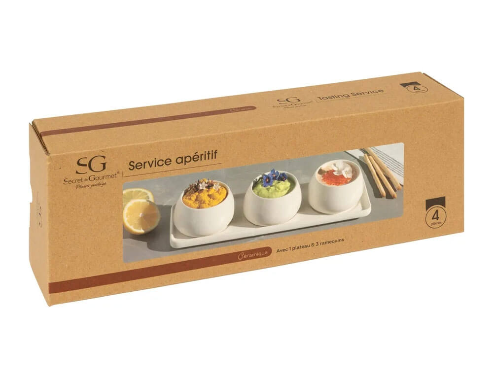 Σερβίρετε τα αγαπημένα σας σνακ ή σάλτσες με το σετ σερβιρίσματος από την Secret de Gourmet. Το σετ αποτελείται από 3 μπωλ σε ίδιο μέγεθος σε λευκή απόχρωση και έναν δίσκο. Ο δίσκος διαθέτει εσοχή για να παραμένουν σταθερά τα μπωλ. Τα μπωλ και ο δίσκος είναι κατασκευασμένα από κεραμικό υλικό.