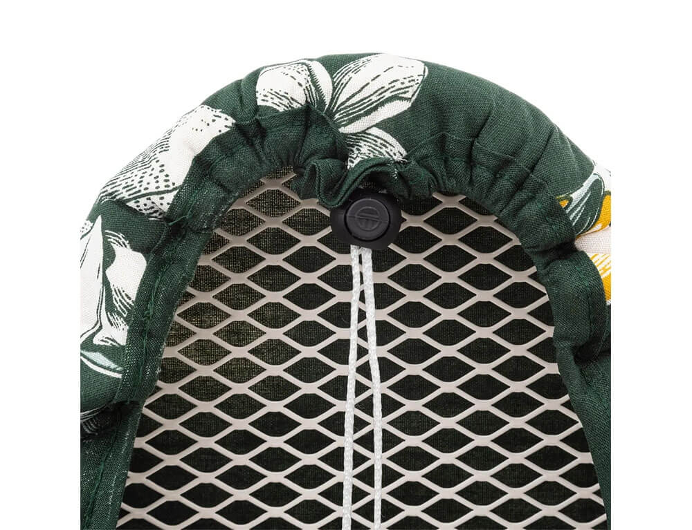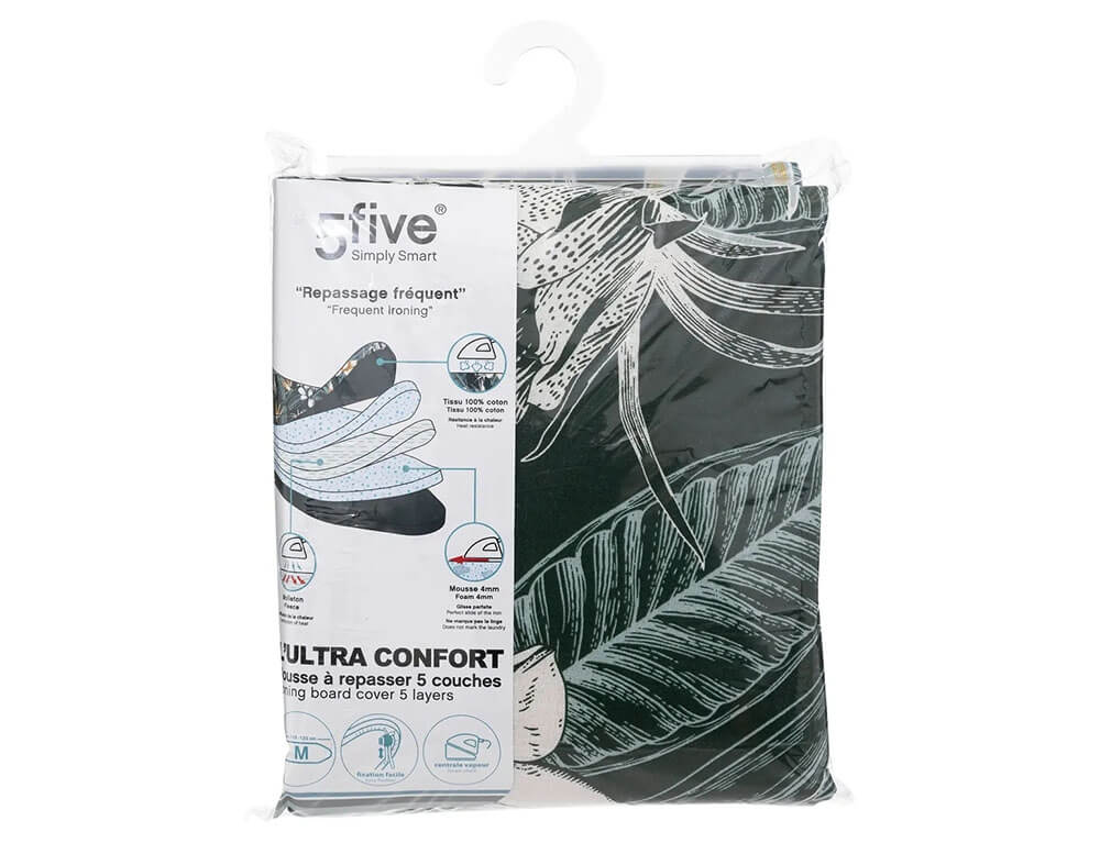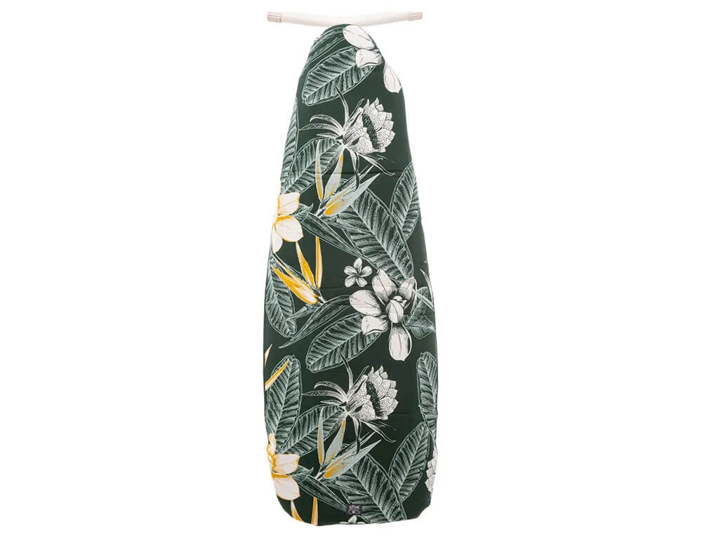 Κάλυμμα σιδερώστρας από τη 5five σε πράσινο χρώμα με tropical σχέδιο. Αποτελείται από 5 στρώσεις για περισσότερη άνεση και απόδοση σιδερώματος. Διαθέτει κορδόνι σύσφιξης με κλιπ ελατηρίου για να έχει πλήρη εφαρμογή στη σιδερώστρα σας. Eίναι κατασκευασμένη από βαμβακερό ύφασμα και αφρό πολυουρεθάνης. Είναι κατάλληλο για σιδερώστρες με μέγεθος 115x45cm και 125x45cm.