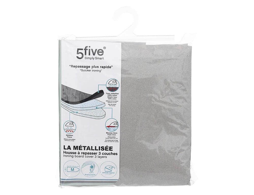 Κάλυμμα σιδερώστρας από τη 5five σε γκρι χρώμα. Αποτελείται από 3 στρώσεις για περισσότερη άνεση και απόδοση σιδερώματος. Διαθέτει κορδόνι σύσφιξης με κλιπ ελατηρίου για να έχει πλήρη εφαρμογή στη σιδερώστρα σας. Eίναι κατασκευασμένη από βαμβακερό ύφασμα και αφρό πολυουρεθάνης. Είναι κατάλληλο για σιδερώστρες με μέγεθος 115x45cm και 125x45cm.