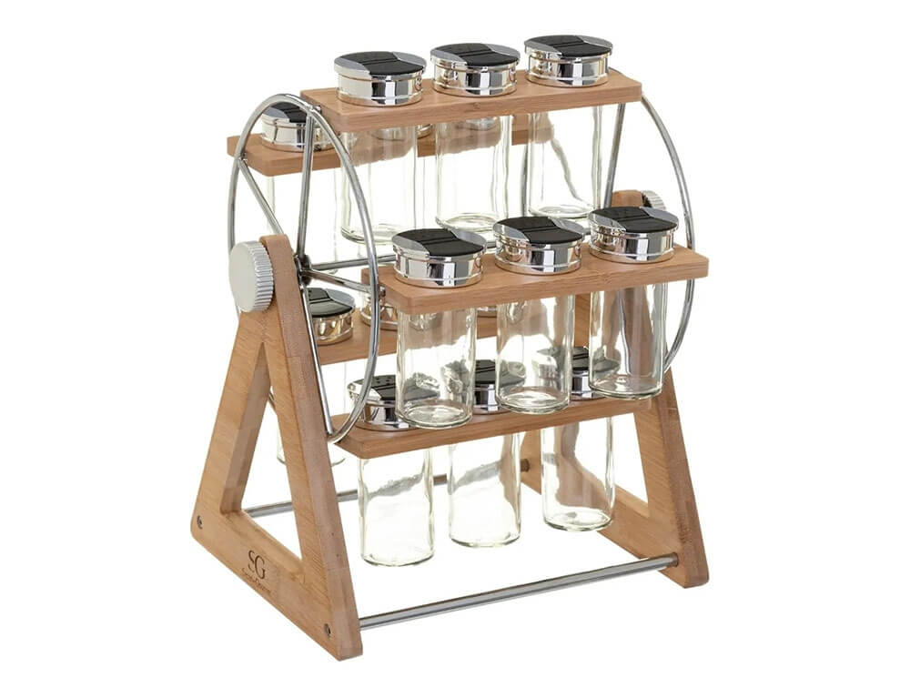 Οργανώστε και τακτοποιήστε τα μπαχαρικά σας με το σετ δοχείων από τη 5five. Το σετ αποτελείται από 15 δοχεία για μπαχαρικά και μια βάση, η οποία περιστρέφεται και δεν καταλαμβάνει πολύ χώρο στον πάγκο ή το ντουλάπι σας. Τα δοχεία έχουν χωρητικότητα 90ml το καθένα και κλείνουν αεροστεγώς ώστε τα μπαχαρικά σας να παραμένουν φρέσκα χωρίς να χάνουν το άρωμά τους για μεγάλο χρονικό διάστημα. Η βάση είναι κατασκευασμένη από ξύλο μπαμπού και τα δοχεία από γυαλί και ανοξείδωτο ατσάλι.