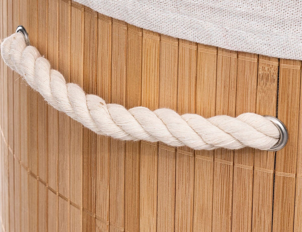 Καλάθι απλύτων με καπάκι κατασκευασμένο από ξύλο μπαμπού σε καφέ απόχρωση. Το καλάθι ρούχων είναι απόλυτα κατάλληλο για μικρούς χώρους και κρατά τα βρώμικα ρούχα σας κρυμμένα. Το ανθεκτικό υλικό και η πολυτελής εμφάνιση αυτού του καλαθιού για άπλυτα ρούχα δίνουν στο μπάνιο σας μια εντελώς νέα εμφάνιση. Εσωτερικά διαθέτει υφασμάτινη θήκη για να μην φεύγουν τα ρούχα σας έξω από το καλάθι. Επίσης, διαθέτει χερούλια για να το μεταφέρετε πιο εύκολα και η θήκη αφαιρείται εύκολα και μπορεί να πλυθεί.