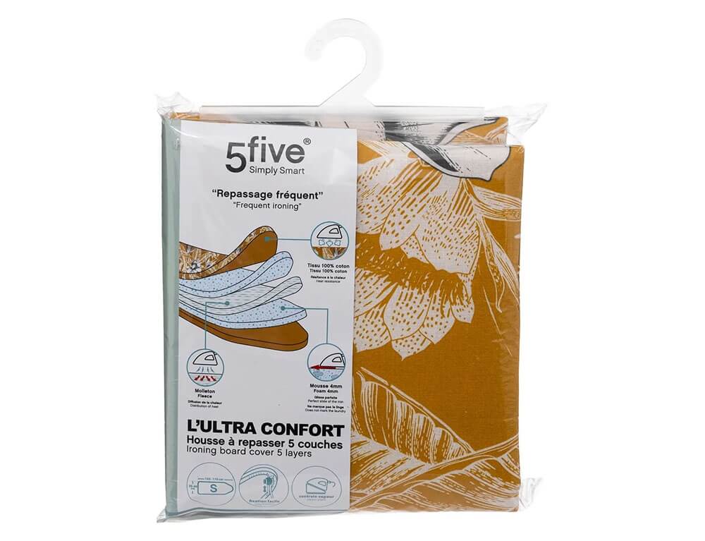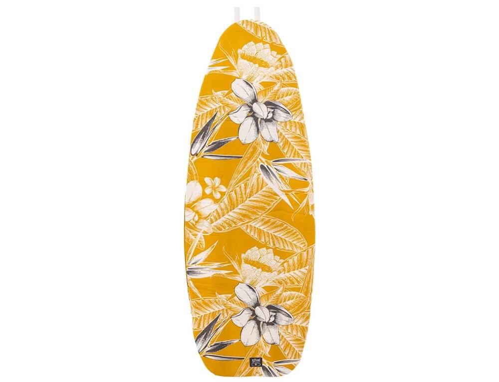 Κάλυμμα σιδερώστρας από τη 5five σε κίτρινο χρώμα με tropical σχέδιο. Αποτελείται από 5 στρώσεις για περισσότερη άνεση και απόδοση σιδερώματος. Διαθέτει κορδόνι σύσφιξης με κλιπ ελατηρίου για να έχει πλήρη εφαρμογή στη σιδερώστρα σας. Eίναι κατασκευασμένη από βαμβακερό ύφασμα και αφρό πολυουρεθάνης. Είναι κατάλληλο για σιδερώστρες με μέγεθος 105x30cm και 110x40cm.