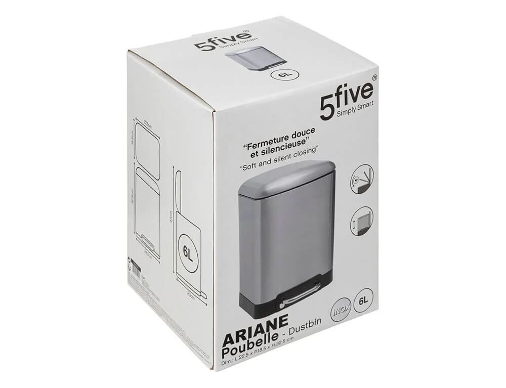 Kάδος απορριμάτων από τη 5five με χωρητικότητα 6 λίτρα. Είναι κατασκευασμένος από μέταλλο, διαθέτει ανθεκτική κατασκευή με πεντάλ και καπάκι που κλείνει αργά χωρίς να προκαλεί θόρυβο. Εσωτερικά διαθέτει πλαστικό κάδο που αφαιρείται εύκολα, ώστε να τον πλένετε και να τον επανατοποθετείτε. Στο πίσω μέρος διαθέτει λαβή για πιο εύκολη μεταφορά.