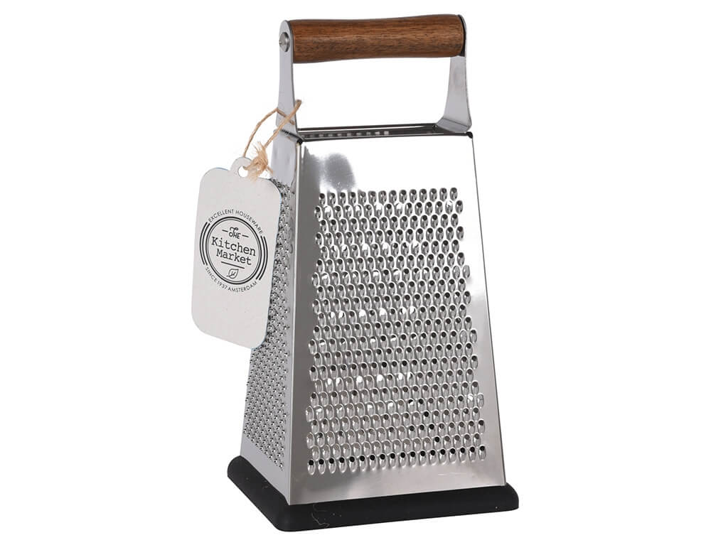 Ο τρίφτης της εταιρείας Excellent Houseware διαθέτει 4 πλευρές, ώστε να μπορείτε να τρίψετε ό,τι θέλετε σε διαφορετικά μεγέθη. Είναι κατασκευασμένος από ανοξείδωτο ατσάλι και διαθέτει λαβή από ξύλο ακακίας και βάση από σιλικόνη. Η λαβή και η βάση είναι αντιολισθητικές και εξασφαλίζεται καλύτερη σταθερότητα και περισσότερη άνεση.