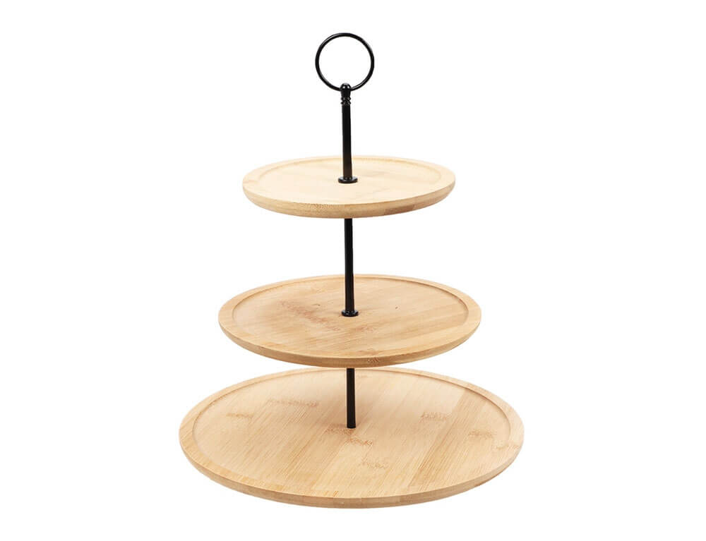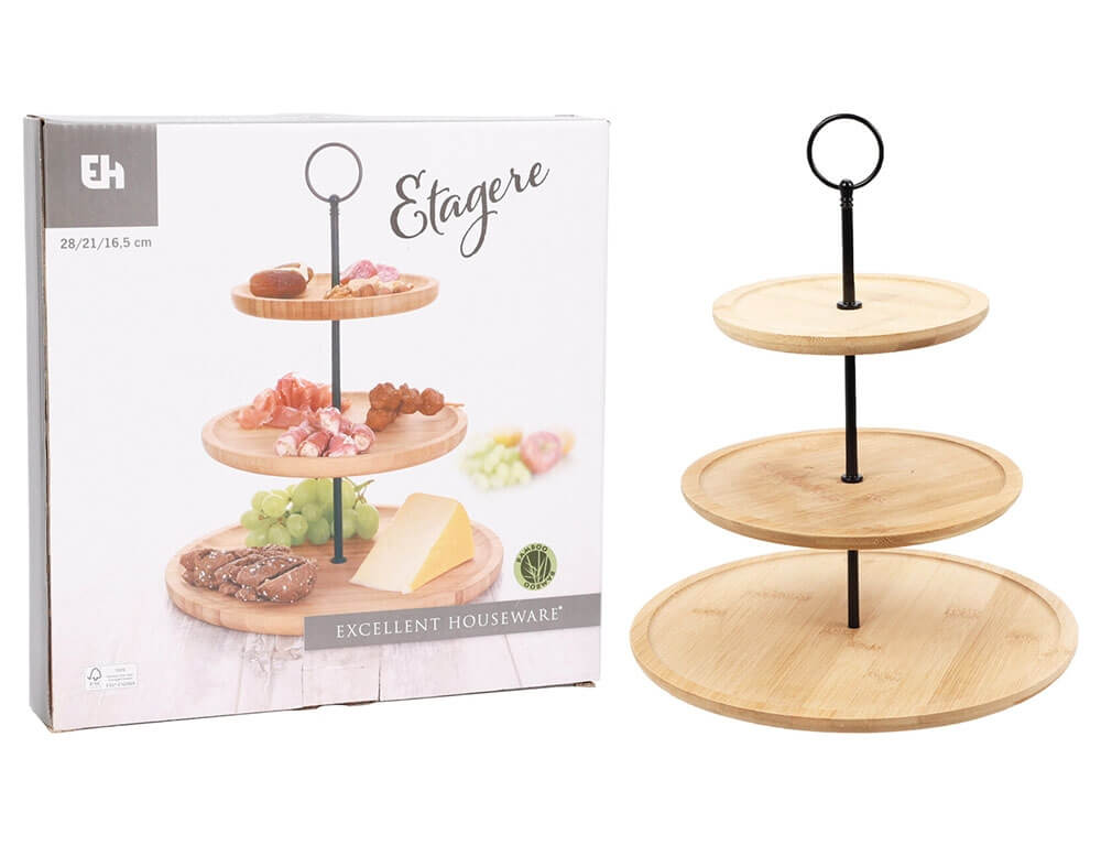 Σερβίρετε τα αγαπημένα σας γλυκίσματα, σνακ και πολλά άλλα με την εταζέρα της Excellent Houseware. Θα δώσει ένα φυσικό, ρουστίκ στιλ στο χώρο σας που θα εντυπωσιάσει με την απλότητά του. Διαθέτει 3 επίπεδα και είναι κατασκευασμένη από ξύλο μπαμπού με καμπύλη στις άκρες για να μην πέσει τίποτα κάτω.