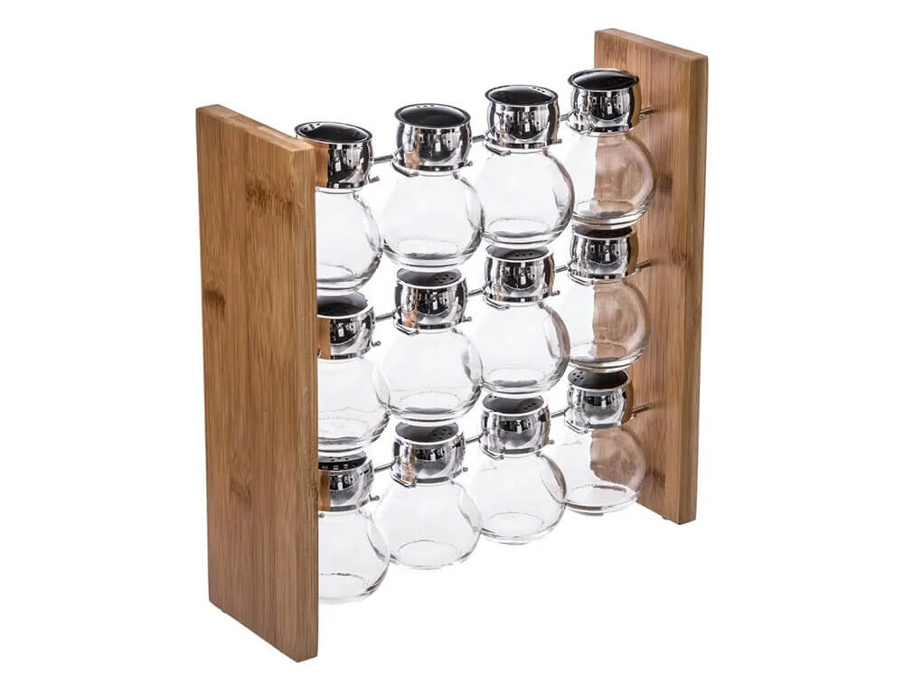 Οργανώστε και τακτοποιήστε τα μπαχαρικά σας με το σετ δοχείων από τη 5five. Το σετ αποτελείται από 12 δοχεία για μπαχαρικά και μια βάση, η οποία δεν καταλαμβάνει πολύ χώρο στον πάγκο ή το ντουλάπι σας. Τα δοχεία έχουν χωρητικότητα 90ml το καθένα και κλείνουν αεροστεγώς ώστε τα μπαχαρικά σας να παραμένουν φρέσκα χωρίς να χάνουν το άρωμά τους για μεγάλο χρονικό διάστημα. Η βάση είναι κατασκευασμένη από ξύλο μπαμπού και τα δοχεία από γυαλί και ανοξείδωτο ατσάλι.