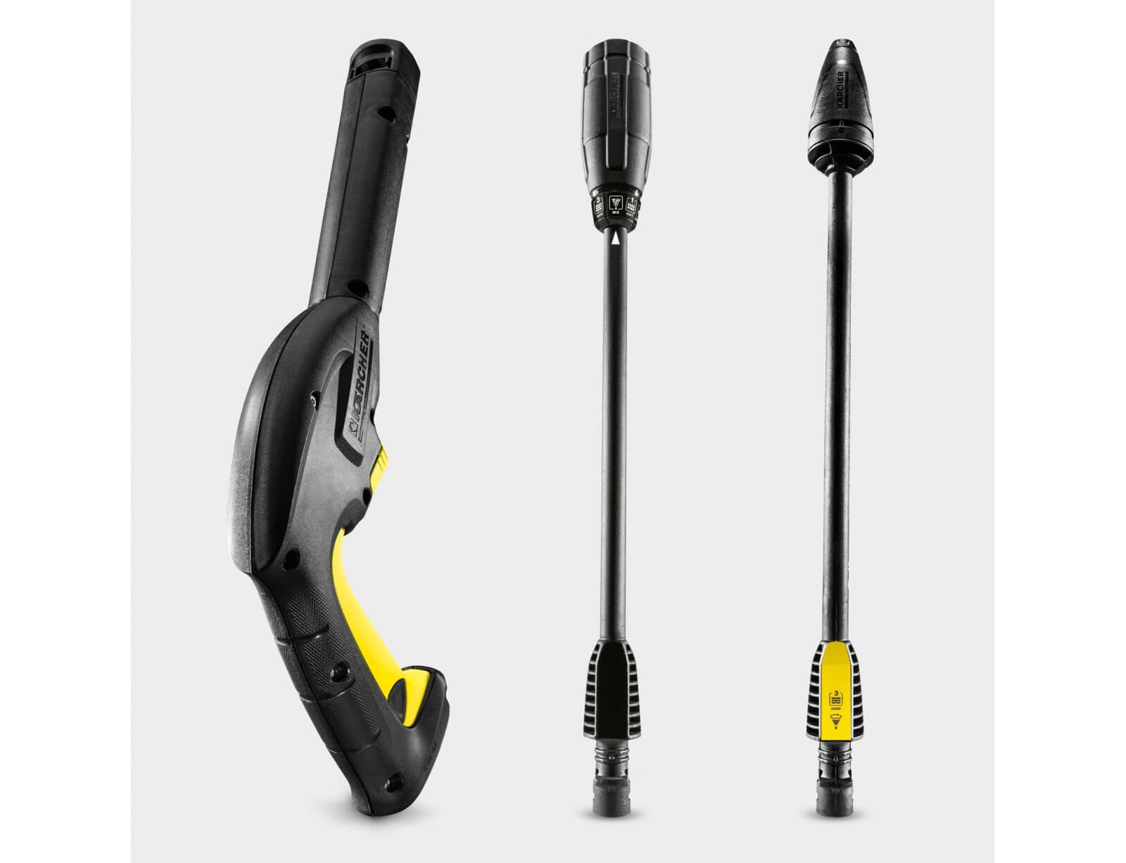 Εύκολη τοποθέτηση και περιστροφή – διατίθενται δύο διαφορετικές κάνες ψεκασμού. Βέλτιστη ρύθμιση πίεσης – δυνατότητα επιλογής τριών ρυθμίσεων πίεσης και μίας ρύθμισης απορρυπαντικού. Εύκολος έλεγχος – οι επιλεγμένες ρυθμίσεις εμφανίζονται στις κάνες ψεκασμού με σύμβολα.