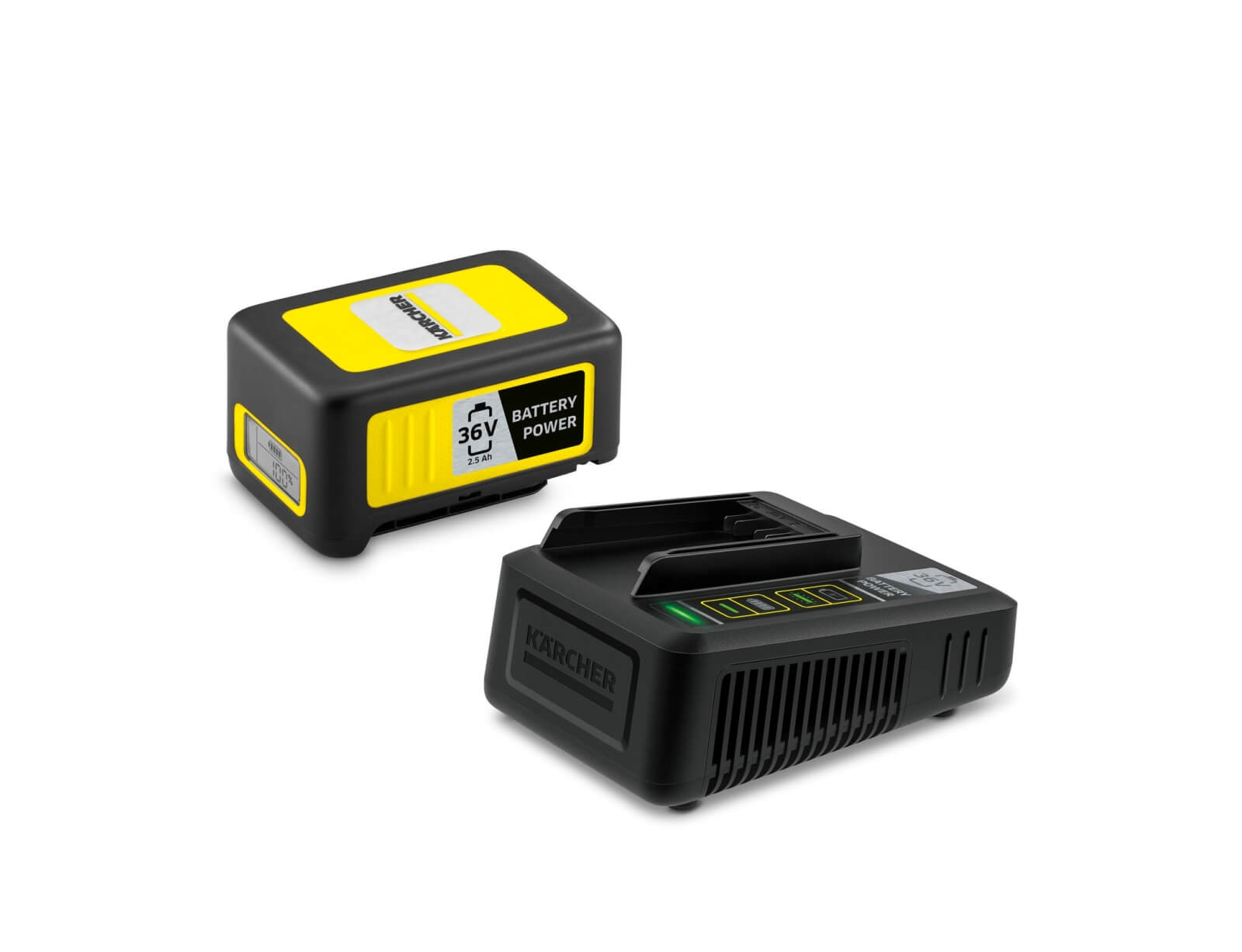 Ένα σετ για όλες τις συσκευές της πλατφόρμας μπαταριών 36 V της Kärcher: Το Kärcher Battery Power 36/25 Starter Kit, το οποίο περιλαμβάνει την μπαταρία 36V / 2,5 Ah Battery Power της Kärcher με την καινοτόμο τεχνολογία πραγματικού χρόνου (Real Time Technology) και τον φορτιστή ταχείας φόρτισης μπαταριών 36 V ο οποίος μπορεί να φορτίσει την μπαταρία έως και στο 80% σε μόλις 48 λεπτά.