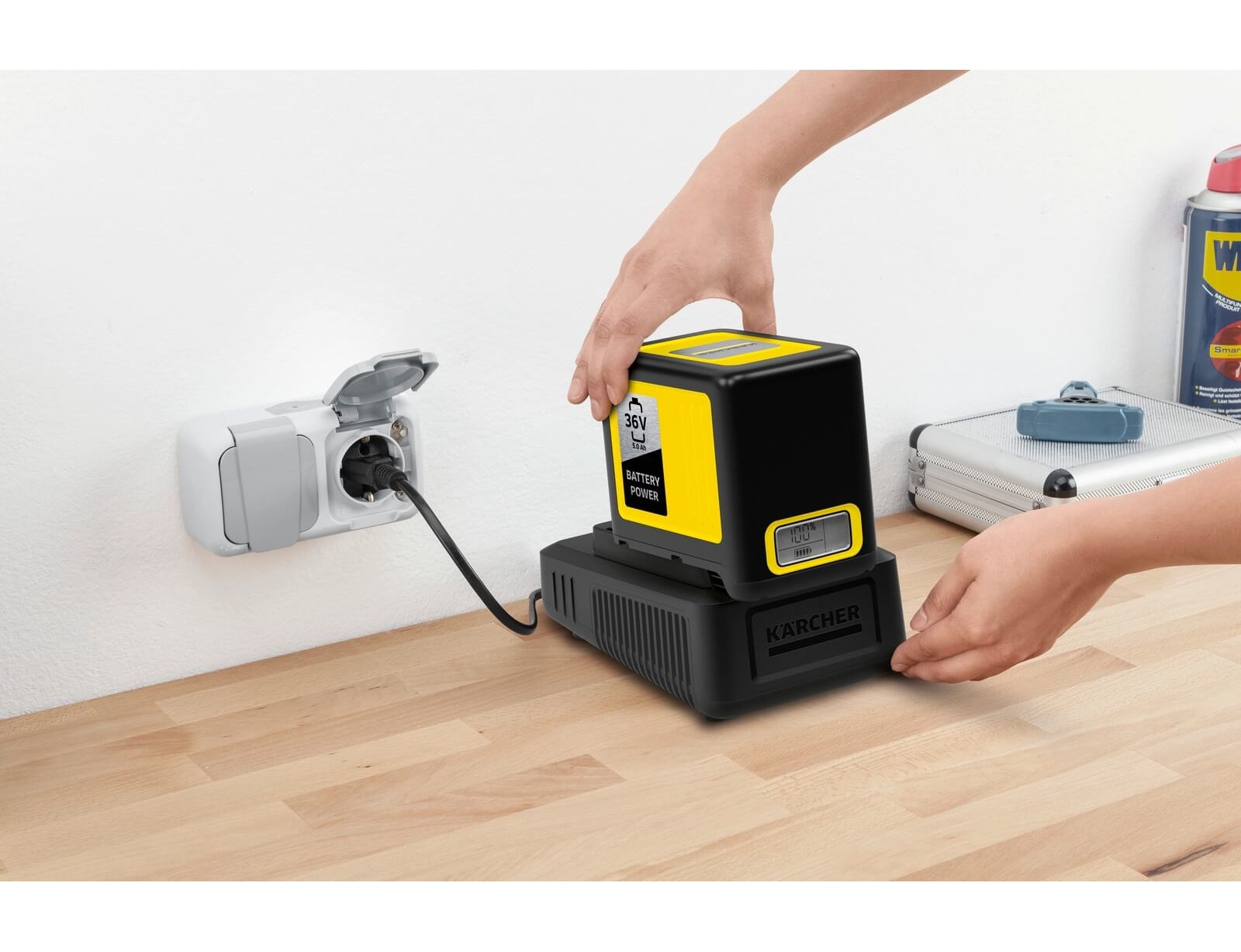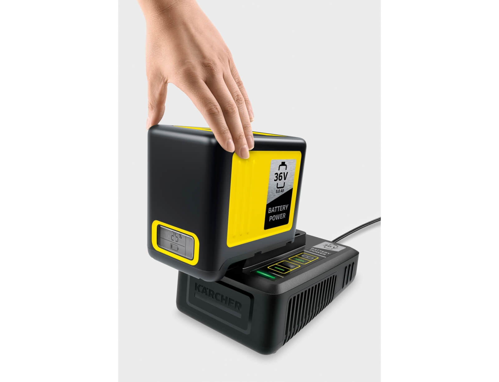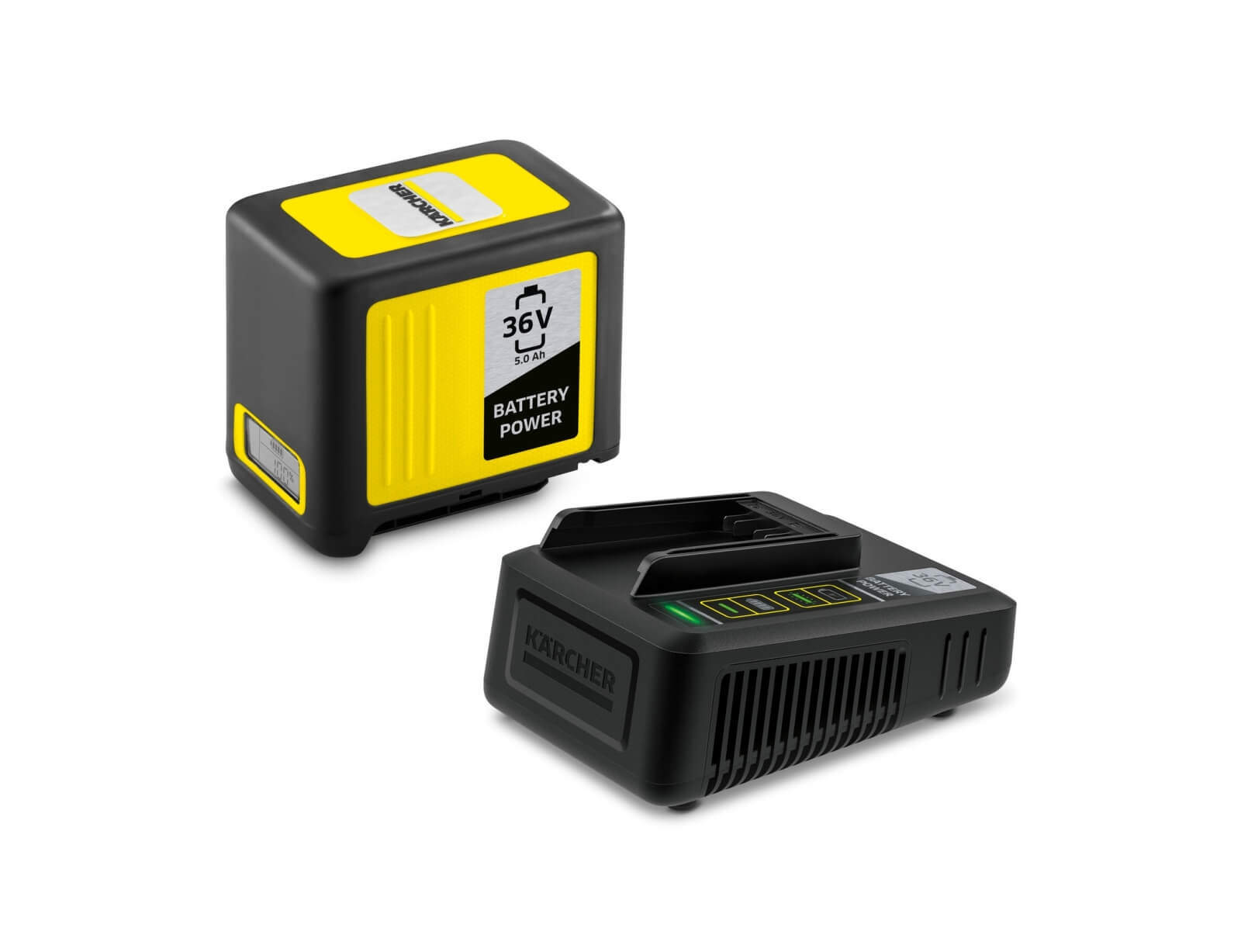 Ο φορτιστής ταχείας φόρτισης που περιλαμβάνεται στο Kärcher Battery Power 36/50 Starter Kit φορτίζει την μπαταρία 36V / 5,0Ah Battery Power της Kärcher έως και στο 80% μέσα σε μόλις 1,5 ώρα. Το σετ είναι κατάλληλο για χρήση σε όλες τις συσκευές που ανήκουν στην πλατφόρμα μπαταριών 36 V της Kärcher.