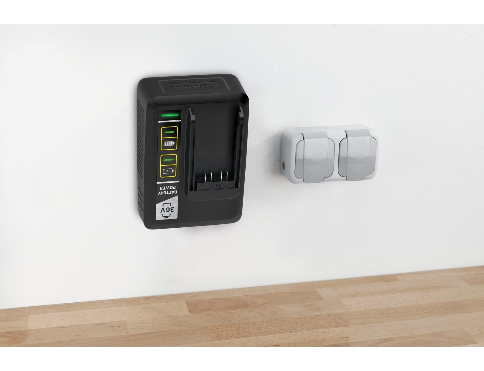 Φορτίζει την ανταλλάξιμη μπαταρία 36V / 5,0Ah της πλατφόρμας Battery Power της Kärcher στο 80% σε 1,5 ώρα.