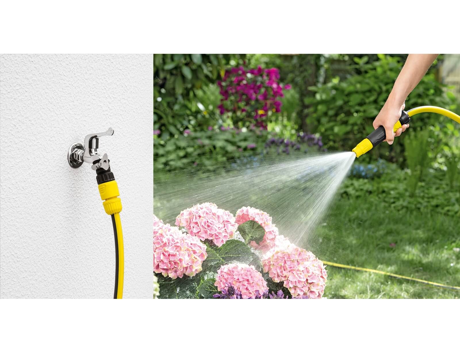 Το τέλεια συντονισμένο ακροφύσιο για τον κήπο σας. Το ακροφύσιο (2.645-64.0) είναι ιδανικό για απλές εργασίες ποτίσματος. Χάρη στις συνεχώς ρυθμιζόμενες επιλογές ψεκασμού, η διανομή του νερού μπορεί να εναλλάσσεται μεταξύ κωνικής δεσμης και δέσμης σημείο, εάν χρειάζεται. Μπορεί να χρησιμοποιηθεί τόσο για το πότισμα, όσο καο για την απομάκρυνση ρύπων γύρω από τον κήπο. Όταν το ακροφύσιο δεν χρησιμοποιείται, η ροή του νερού στο ακροφύσιο ψεκασμού μπορεί να κλείσει. Το σετ ακόμη περιλαμβάνει ένα σύνδεσμο βρύσης G3/4'' και έναν μειωτήτα G1/2'', καθώς και δυο ισχυρούς συνδέσμους γενικής χρήσης - ο ένας με Aqua Stop. Αυτό αποτρέπει τη ροή του νερού στο τέλος του λάστιχου, ακόμη και όταν η βρύση είναι ανοιχτή, για παράδειγμα όταν έχει αφαιρεθεί το ακροφύσιο. Οι σύνδεσμοι μπορούν ακόμη να χρησιμοποιηθούν με όλες τις συμβατικές διαμέτρους λάστιχων. Επιπλέον, τα ακροφύσια και οι σύνδεσμοι της Kärcher είναι συμβατά με όλα τα διαθέσιμα συστήματα click και μπορούν να συνδεθούν στα λάστιχα το κήπου, χωρίς προβλήματα.