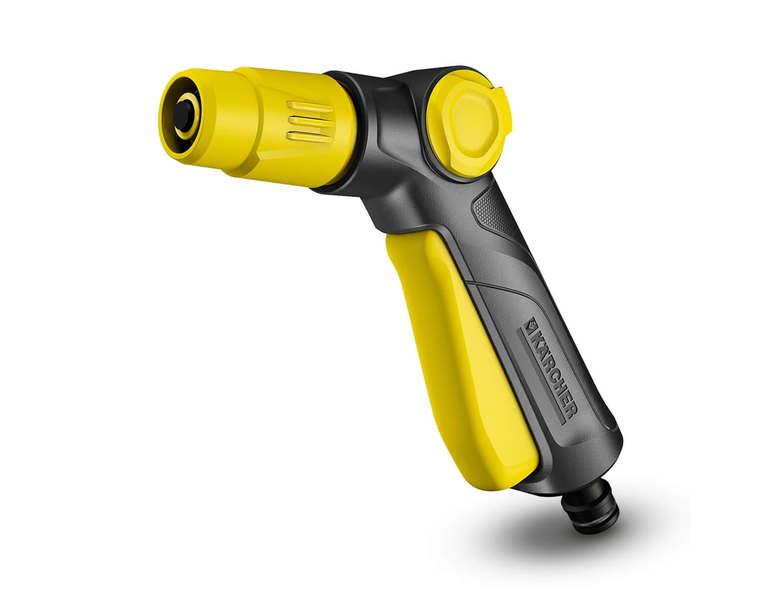 Το spray gun κάνει το πότισμα του κήπου εξαιρετικά εύκολο. Χάρη στη σκανδάλη που κλειδώνει, με τη λειτουργία κλειδώματος, η ροή του νερού στο στόμιο του λάστιχου μπορεί να διατηρηθεί στιγμιαία, χωρίς την ανάγκη για άμεση πίεση. Χρησιμοποιώντας τη βαλβίδα ελέγχου, η οποία μπορεί να λειτουργήσει με το ένα χέρι, η ροή του νερού μπορεί να προσαρμοστεί σύμφωνα με τις εκάστοτε ανάγκες. Το spray gun έχει 2 επιλογές ψεκασμού: σημείου και κωνικής δέσμης, οι οποίες μπορούν να προσαρμόζονται συνεχώς σύμφωνα με τις ανάγκες. Τα λουλούδια και οι ζαρντινιέρες μπορούν να ποτιστούν εύκολα, ενώ οι βεράντες και τα έπιπλα κήπου να καθαριστούν από τους έντονους ρύπους, χρησιμοποιώντας την κωνική δέσμη. Αυτό κάνει το spray gun ιδανικό τόσο για εργασίες ποτίσματος, όσο και για εργασίες καθαρισμού. Με την ευκαιρία: τα στόμια της Kärcher είναι συμβατά με όλα τα διαθέσιμα συστήματα κλικ και μπορούν να συνδεθούν στο λάστιχο το κήπου χωρίς προβλήματα.