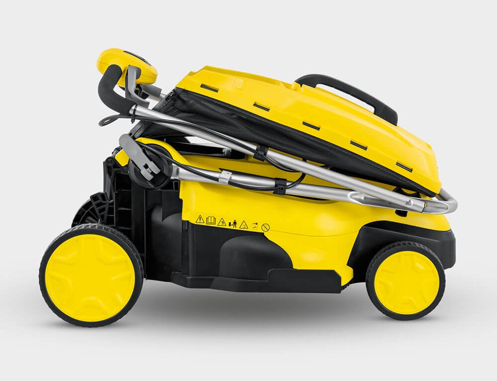 Η πτυσσόμενη λαβή οδηγού επιτρέπει την αποθήκευση με εξοικονόμηση χώρου. Το υφασμάτινο δοχείο συλλογής μπορεί να διπλωθεί σε εξαιρετικά μικρό μέγεθος και καταλαμβάνει ελάχιστο χώρο όταν είναι τοποθετημένο στη χλοοκοπτική μηχανή.