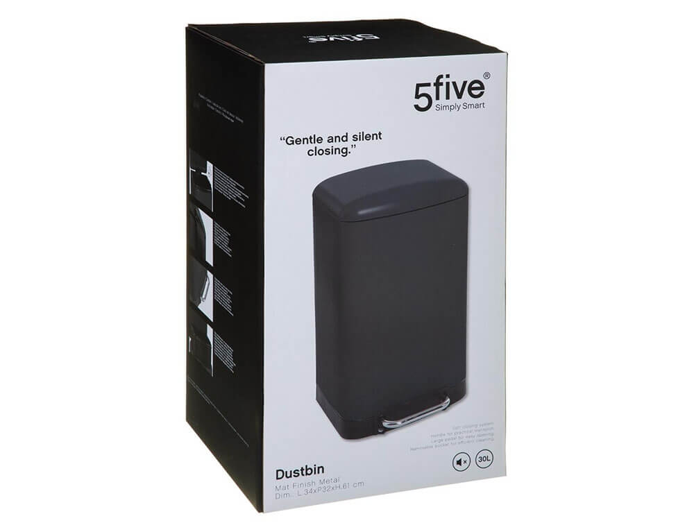 Kάδος απορριμάτων από τη 5five με χωρητικότητα 30 λίτρα. Είναι κατασκευασμένος από μέταλλο, διαθέτει ανθεκτική κατασκευή με πεντάλ και καπάκι που κλείνει αργά χωρίς να προκαλεί θόρυβο. Εσωτερικά διαθέτει πλαστικό κάδο που αφαιρείται εύκολα, ώστε να τον πλένετε και να τον επανατοποθετείτε. Προτείνεται χρήση σακούλας 50lt και στο πίσω μέρος διαθέτει λαβή για πιο εύκολη μεταφορά.