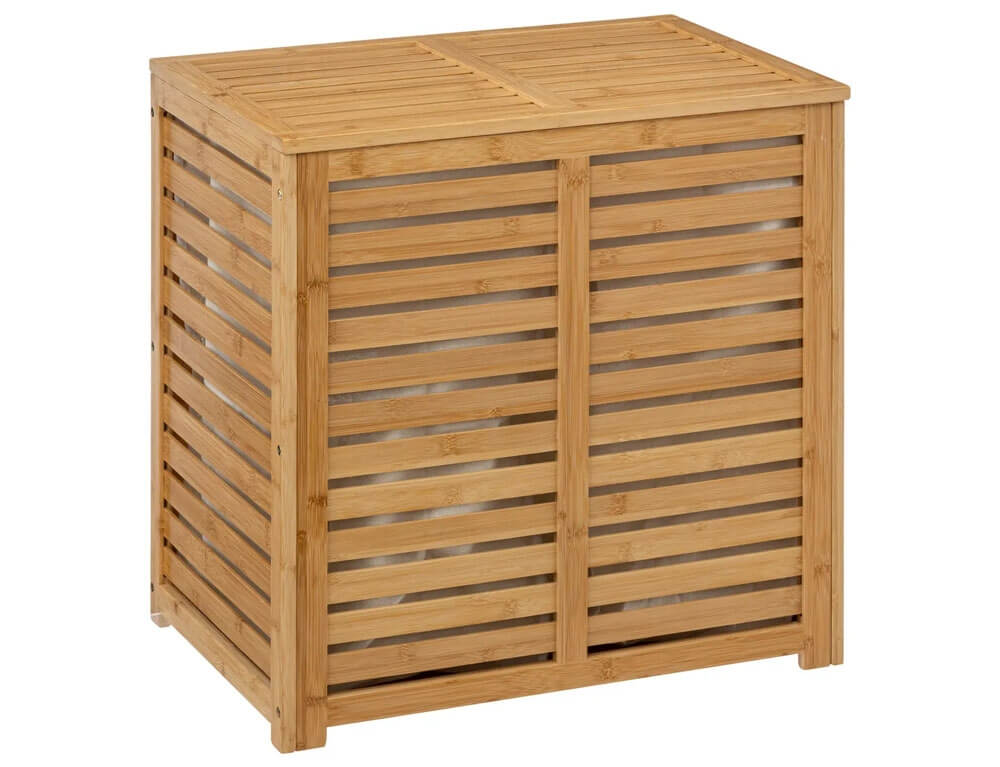 Καλάθι απλύτων με καπάκι κατασκευασμένο από ξύλο μπαμπού σε καφέ απόχρωση. Το καλάθι ρούχων είναι απόλυτα κατάλληλο για μικρούς χώρους και κρατά τα βρώμικα ρούχα σας κρυμμένα. Το ανθεκτικό υλικό και η πολυτελής εμφάνιση αυτού του καλαθιού για άπλυτα ρούχα δίνουν στο μπάνιο σας μια εντελώς νέα εμφάνιση. Εσωτερικά διαθέτει υφασμάτινη θήκη για να μην φεύγουν τα ρούχα σας έξω από το καλάθι.