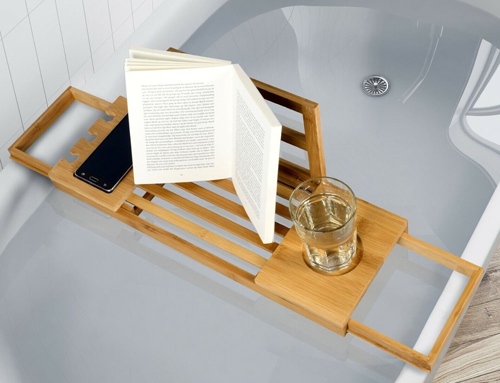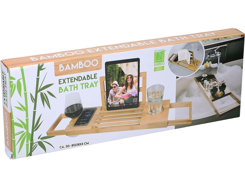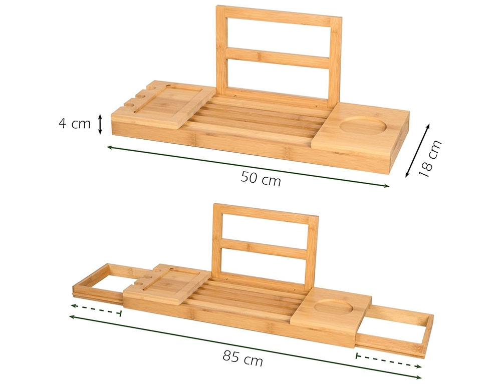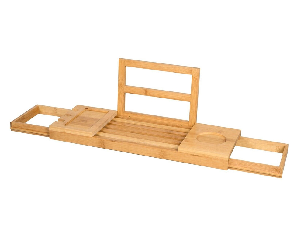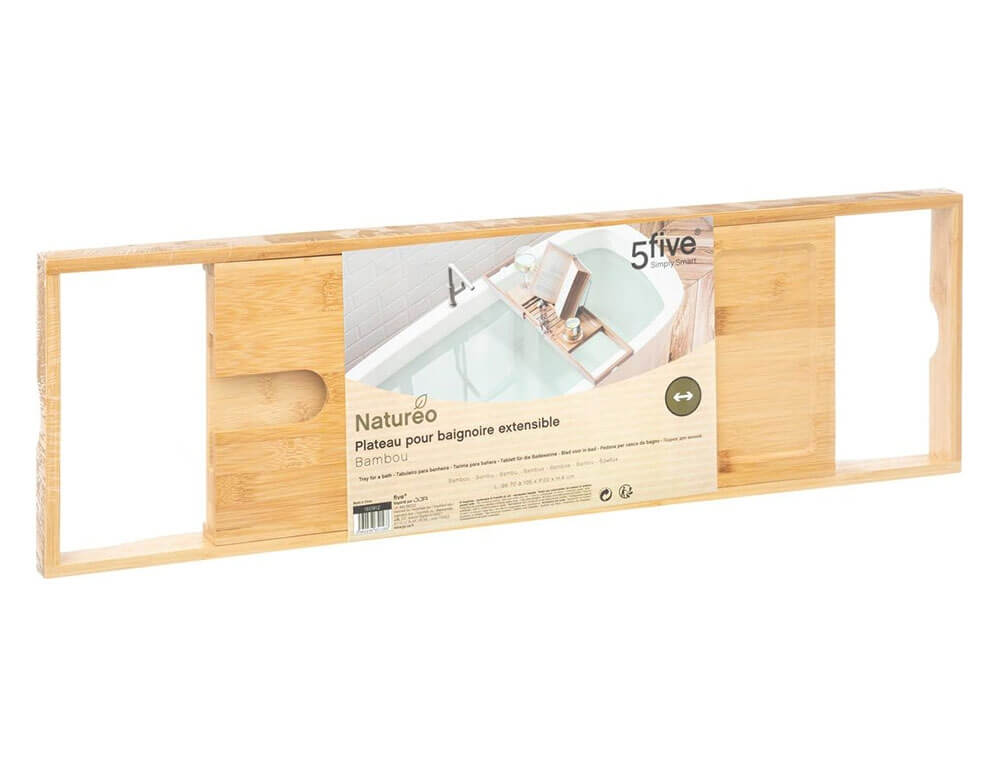 Με το ράφι από την 5five μπορείτε να απολαύσετε ένα χαλαρωτικό μπάνιο έχοντας κοντά σας τα προϊόντα προσωπική σας περιποίησης, ένα ποτήρι κρασί, ένα βιβλίο ή ακόμα το κινητό σας. Απλά τοποθετήστε το στη μπανιέρα σας. Είναι κατασκευασμένο από ξύλο μπαμπού, ένα υλικό φιλικό προς το περιβάλλον και ανθεκτικό στο χρόνο. Επίσης, είναι λιγότερο επιρρεπές σε φούσκωμα και μπορεί να καθαριστεί εύκολα.