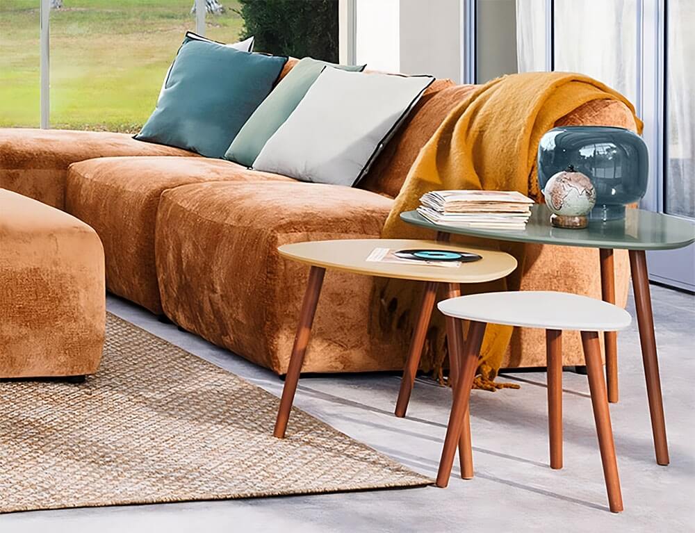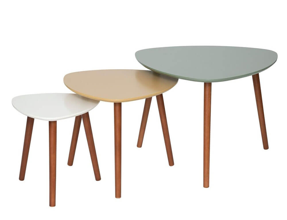 Το σετ βοηθητικά τραπεζάκια σαλονιού είναι ιδανικό για τοποθέτηση στο πλάι του καναπέ αλλά και σε διαφορετικά σημεία του σπιτιού προσφέροντας επιπλέον χώρο για την τοποθέτηση διακοσμητικών ή άλλων μικροαντικειμένων. Το σετ αποτελείται από τρία τραπεζάκια διαφορετικών μεγεθών σε τριγωνικό σχήμα και με τους παστέλ χρωματισμούς τους θα δώσουν στο χώρο μια μοντέρνα και μίνιμαλ αισθητική. Είναι κατασκευασμένα από MDF (ινοσανίδα), ένα παράγωγο ξύλου από κομμάτια, ίνες και υπολείμματα ξύλου και διαθέτουν 3 πόδια από ξύλο Hevea, για περισσότερη σταθερότητα.