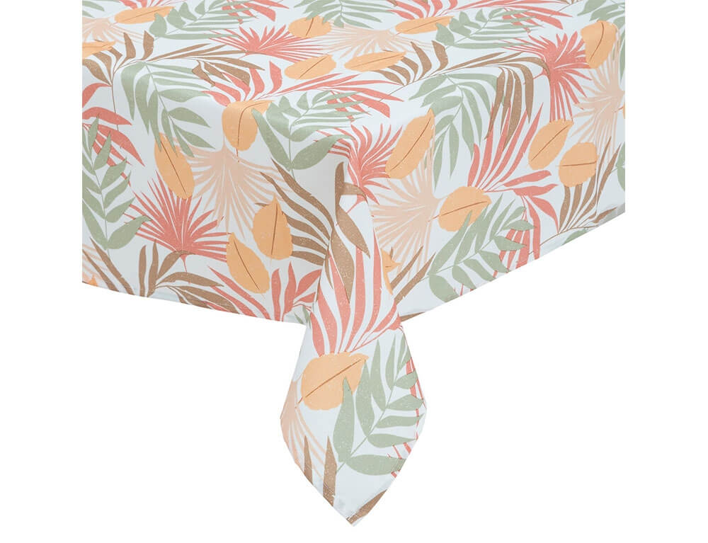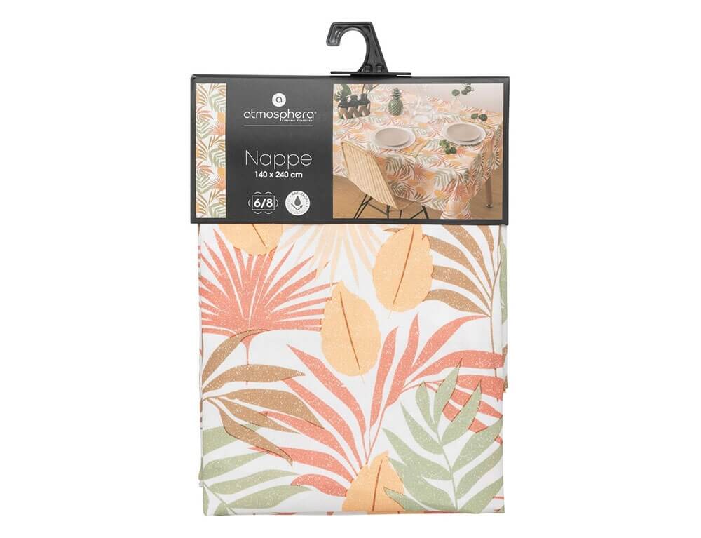 Ανανεώστε και αναδείξτε την τραπεζαρία σας με το τραπεζομάντηλο Sahypa από την Atmosphera. Ο ιδιαίτερος συνδυασμός χρωμάτων σε τροπικό σχέδιο θα δώσει μια φρέσκια πνοή στο χώρο σας. Είναι κατασκευασμένο από 100% πολυεστέρα και διαθέτει επίστρωση, η οποία δεν λεκιάζει. Είναι πολύ πρακτικό, εύχρηστο και καθαρίζεται εύκολα. Για καλύτερη φροντίδα συνίσταται πλύση και σιδέρωμα σε χαμηλές θερμοκρασίες και να μην χρησιμοποιείται κάποιο λευκαντικό.