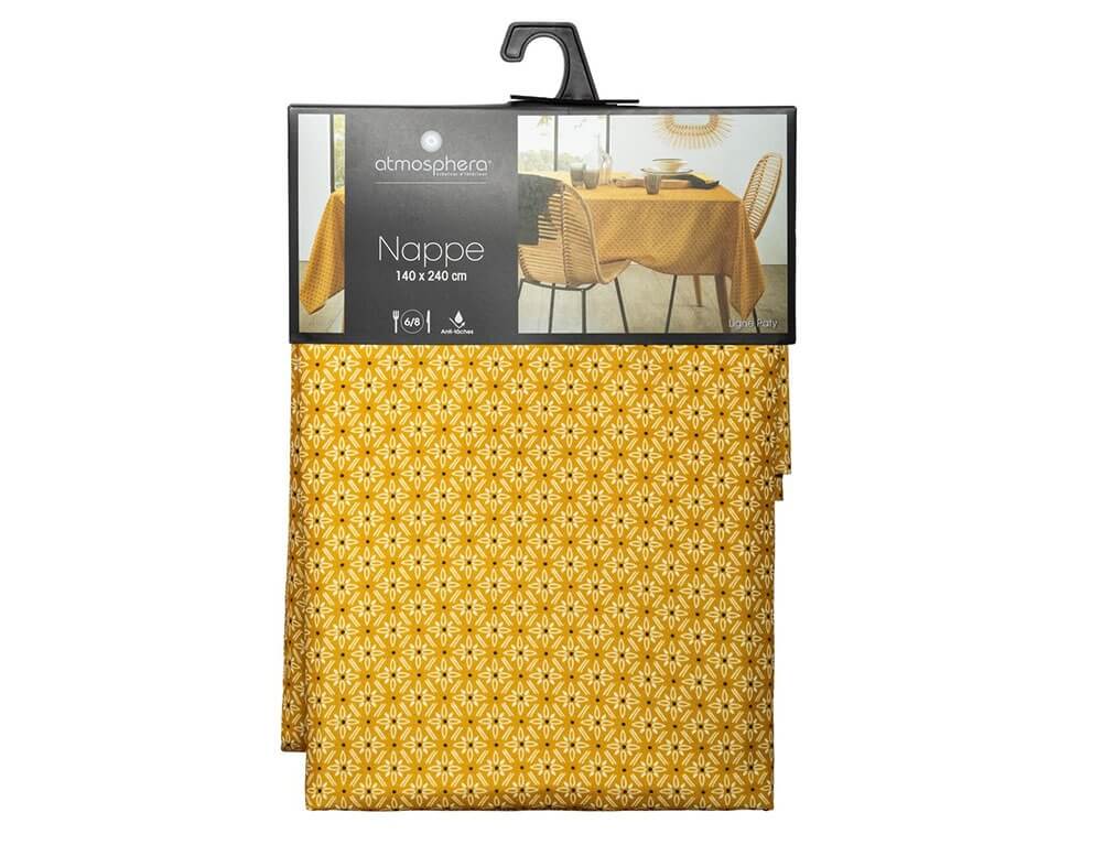 Ανανεώστε και αναδείξτε την τραπεζαρία σας με το τραπεζομάντηλο Paty από την Atmosphera. Με Art Deco μοτίβα σε κίτρινη απόχρωση θα δώσει μια μοντέρνα αίσθηση στο χώρο σας. Είναι κατασκευασμένο από 100% πολυεστέρα και διαθέτει επίστρωση, η οποία δεν λεκιάζει. Είναι πολύ πρακτικό, εύχρηστο και καθαρίζεται εύκολα. Για καλύτερη φροντίδα συνίσταται πλύση και σιδέρωμα σε χαμηλές θερμοκρασίες και να μην χρησιμοποιείται κάποιο λευκαντικό.