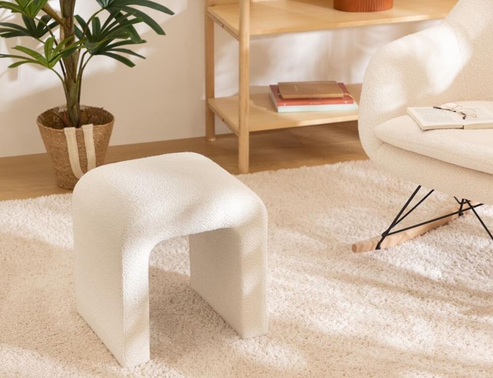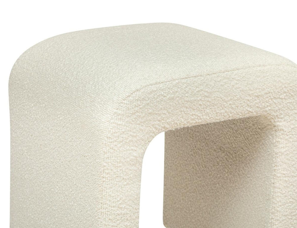 Σκαμπό από πολυεστερικό ύφασμα λευκού χρώματος σε πλέξη boucle, με αντοχή στη τριβή και στη φθορά. Έχει διακοσμητικό αλλά και χρηστικό χαρακτήρα καθώς μπορείτε να το χρησιμοποιήσετε σαν επιπλέον κάθισμα. Eίναι κατασκευασμένο από ξύλο πεύκου και έχει επένδυση αφρού πολυουρεθάνης (PU).
