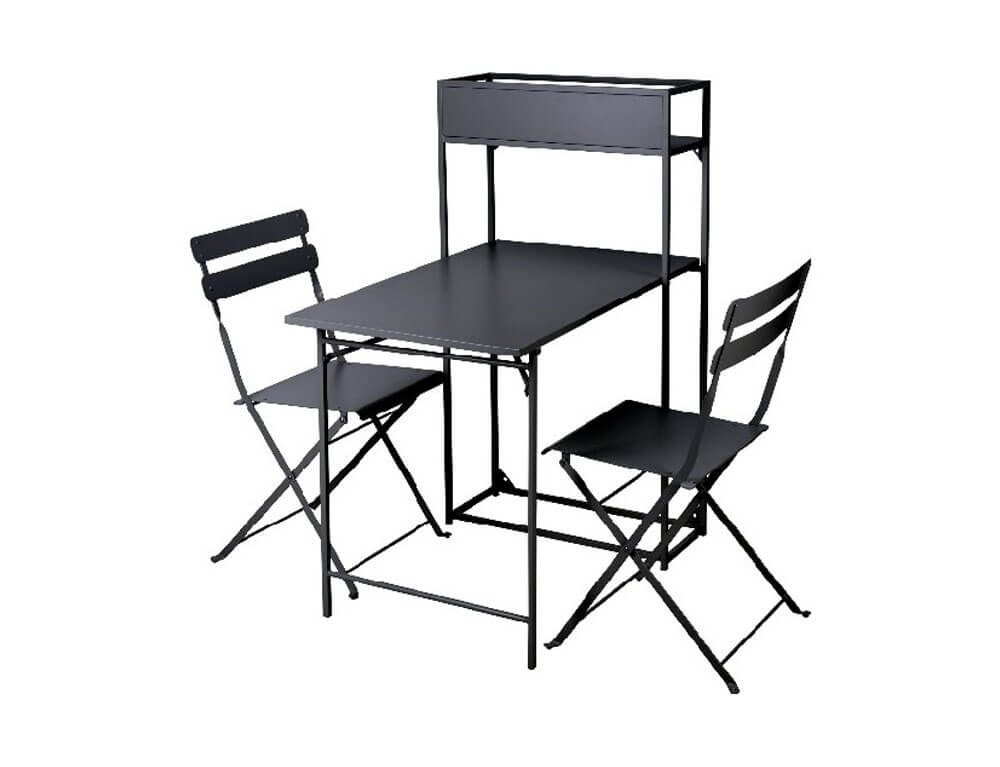 Με αυτό το σετ θα δώσετε χρώμα και θα αναβαθμίσετε τη βεράντα, τον κήπο ή το μπαλκόνι σας και είναι κατάλληλο ακόμα και για τους πιο περιορισμένους χώρους. Το σετ είναι κατασκευασμένο από μέταλλο και είναι ανθεκτικό στο χρόνο και τις καιρικές συνθήκες. To τραπέζι διαθέτει ράφι για να τοποθετείτε διακοσμητικά, γλάστρες ή ό,τι άλλο επιθυμείτε. Το τραπέζι και οι καρέκλες είναι πτυσσόμενα για να μπορείτε να το μετακινήσετε και να το αποθηκεύσετε με μεγάλη ευκολία, ενώ παράλληλα θα εξοικονομήσετε και χώρο.