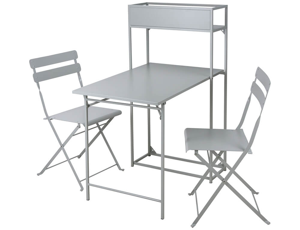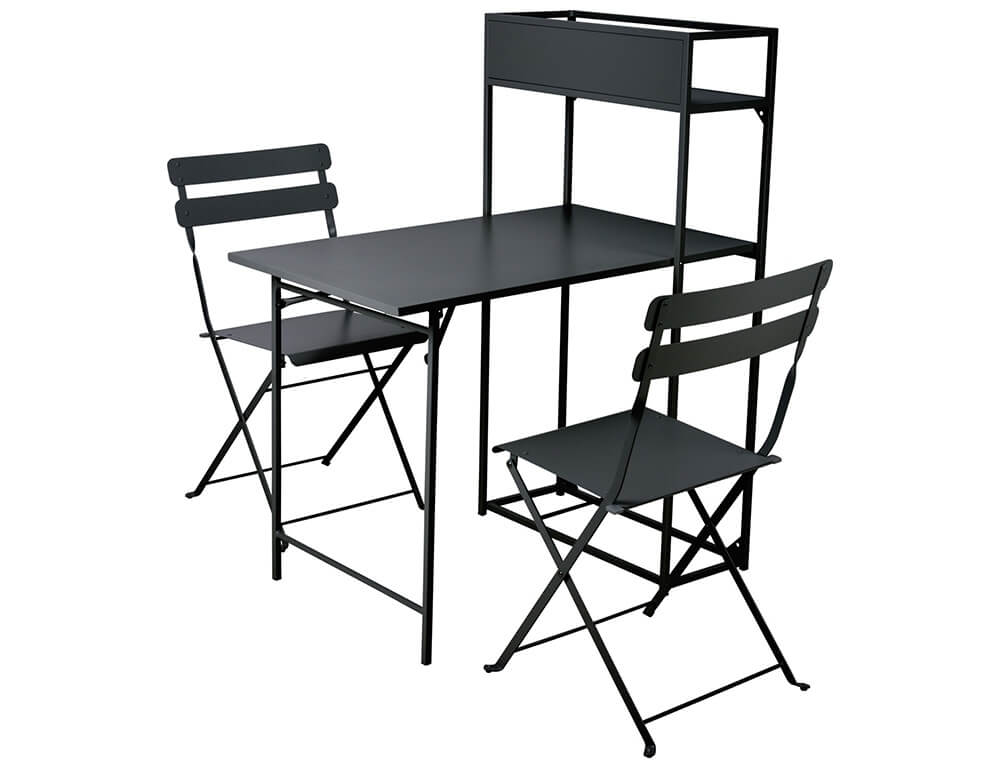 Με αυτό το σετ θα δώσετε χρώμα και θα αναβαθμίσετε τη βεράντα, τον κήπο ή το μπαλκόνι σας και είναι κατάλληλο ακόμα και για τους πιο περιορισμένους χώρους. Το σετ είναι κατασκευασμένο από μέταλλο και είναι ανθεκτικό στο χρόνο και τις καιρικές συνθήκες. To τραπέζι διαθέτει ράφι για να τοποθετείτε διακοσμητικά, γλάστρες ή ό,τι άλλο επιθυμείτε. Το τραπέζι και οι καρέκλες είναι πτυσσόμενα για να μπορείτε να το μετακινήσετε και να το αποθηκεύσετε με μεγάλη ευκολία, ενώ παράλληλα θα εξοικονομήσετε και χώρο.